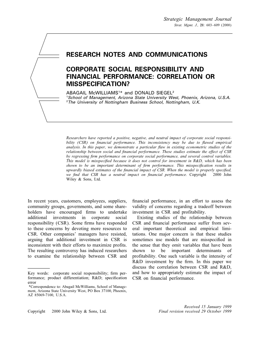 摘要:研究人员已经报告了企业社会责任(CSR)对财务绩效的积极、消极和中立的影响。这种不一致可能是由于有缺陷的实证分析。本文对现有计量经济学研究中社会与财务绩效关系的具体缺陷进行了论证。这些研究通过回归公司在企业社会绩效和一些控制变量方面的表现来估计企业社会责任的影响。这个模型是错误的,因为它不控制研发投资,而研发投资已经被证明是企业绩效的重要决定因素。这种错误设定会导致对企业社会责任财务影响的估计偏高。当模型被正确设定时,我们发现企业社会责任对财务绩效有中性影响。