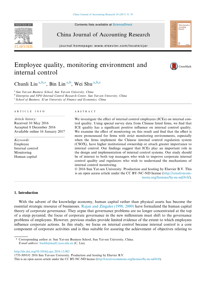 随着知识经济时代的到来,人力资本而非实物资产已成为企业必不可少的战略资源。Rajan和Zingales(1998,2000)正式确立了公司治理的人力资本理论。他们认为治理问题不再集中在陡峭的金字塔顶端;在新的千年里,公司治理的重点必须转移到员工的治理问题上。员工的治理问题。然而,以往的研究提供了有限的证据,证明雇员在多大程度上影响公司行为。在本研究中,我们将重点放在内部控制上,因为内部控制是公司活动的核心组成部分,因此适合于确保实现与业务有关的目标,报告来源(COSO,2013)。我们通过考察内部控制员工与内部控制质量之间的关系,以及监控对这种关系的影响,为有关内部控制的文献做出贡献。