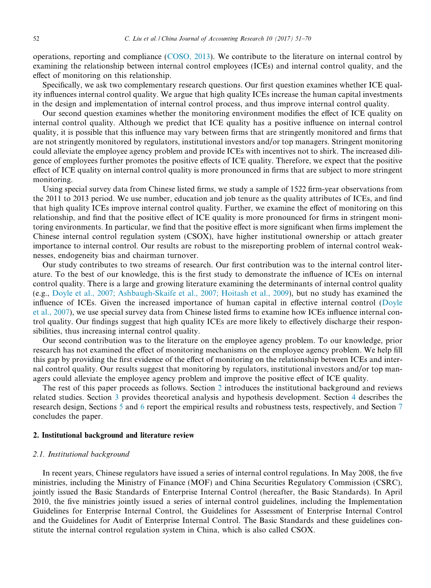 我们的研究对两种研究都有贡献。我们的第一个贡献是内部控制文献。据我们所知,这是第一次证明ICE对内部控制质量的影响的研究。有一大批和越来越多的文献在研究内部控制质量的影响因素(例如,Doyle等人,2007;Ashbaugh-Skaife等人,2007;Hoitash等人,2009),但没有一项研究研究了ICE的影响。鉴于人力资本在有效内部控制中的重要性日益增加(Doyle等人,2007),我们利用中国上市公司的专门调查数据,考察了ICE对内部控制质量的影响。我们的研究结果表明,高质量的ICE更有可能有效地履行职责,从而提高内部控制质量。
