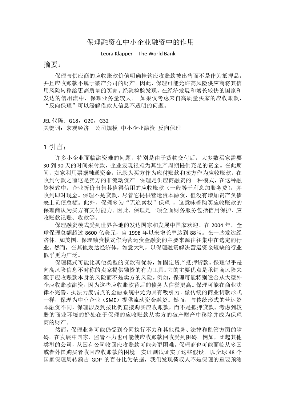 基于NS公司的应收账款融资模式比较研究外文翻译资料 2022-06-12 21:23:26 英语原文共 38 页,剩余内容已隐藏,支付完成后下载完整资料 英语原文共 6 页,剩余内容已隐藏,支付完成后下载完整资料资料编号:[11063],资料为PDF文档或Word文档,PDF文档可免费转换为Word 原文和译文剩余内容已隐藏,您需要先支付 30元 才能查看原文和译文全部内容!立即支付 发小红书推广免费获取该资料资格。点击链接进入获取推广文案即可: Ai一键组稿 | 降AI率 | 降重复率 | 论文一键排版 PREVIOUS NEXT 您可能感兴趣的文章 预算创新、信息质量和部门绩效外文翻译资料 印度信息技术行业财务分析 ——以威普罗和印孚瑟斯公司为例外文翻译资料 真实性与公司治理外文翻译资料 财产责任保险公司投资组合选择的决定因素外文翻译资料 失衡:中国财政联邦制的意外结果外文翻译资料 财务弹性是影响亚洲企业投资效率的因素之一外文翻译资料 风险管理在审计中的地位及其重要性外文翻译资料 杠杆和公司绩效:机构环境是否重要?外文翻译资料 印度尼西亚企业社会、环境与财务绩效之间的关系外文翻译资料 为中国纯电动公交行业(PEB) 发展新型商业模式外文翻译资料