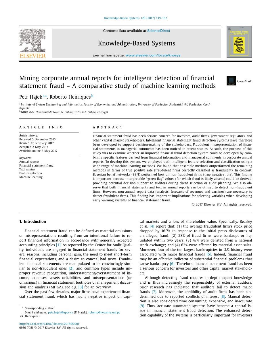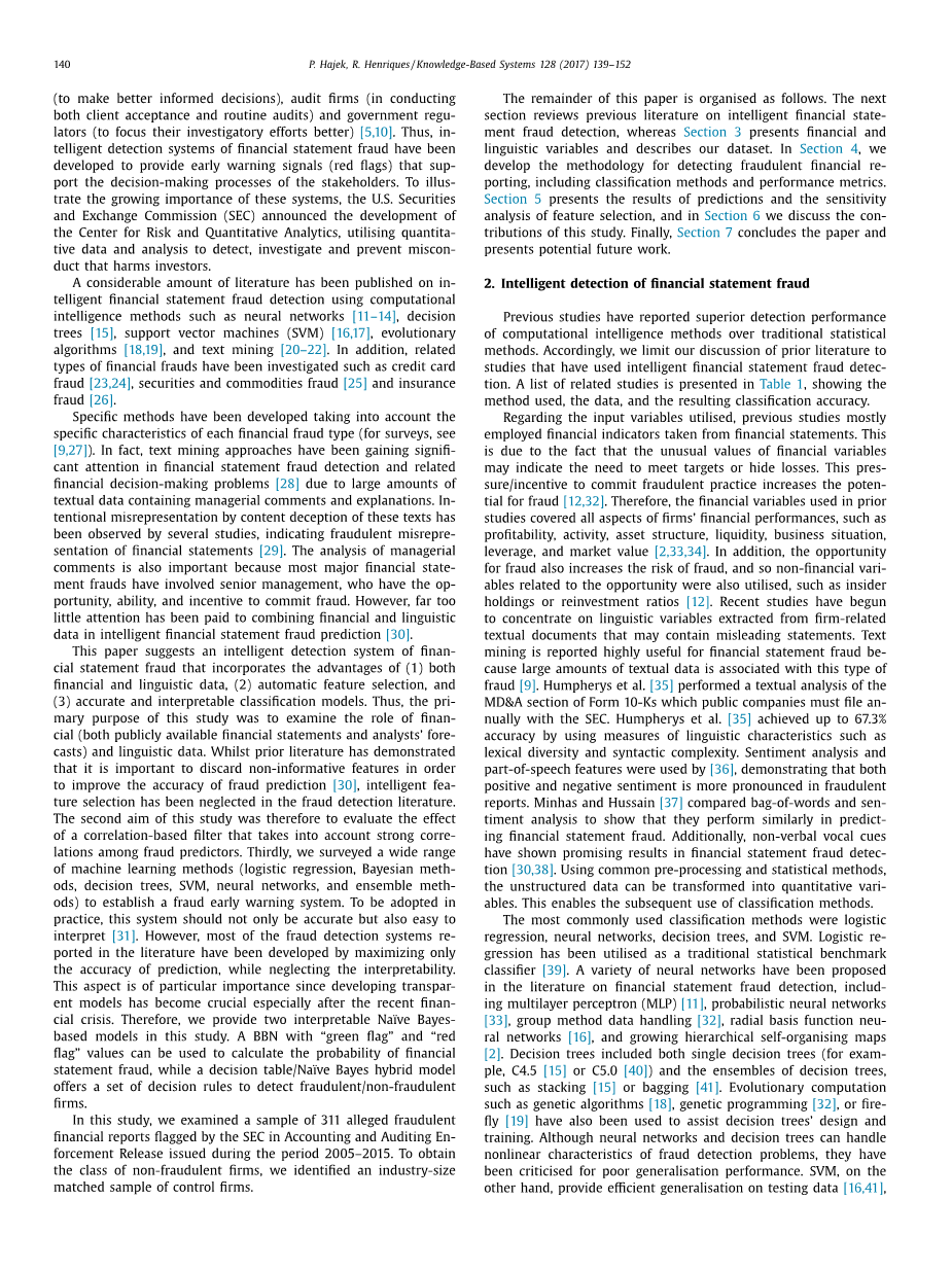 本文提出了一种智能检测欺诈的检测系统,该系统融合了(1)金融和语言数据,(2)自动特征选择,以及(3)准确和可解释的分类模型的优点。因此,本研究的主要目的是研究国家(公开可用的财务报表和分析师的预测)和语言数据的作用。虽然先前的文献已经证明为了提高欺诈预测的准确性而丢弃非信息性特征是重要的[30],但在欺诈检测文献中,智能特征选择被忽略了。因此,本研究的第二个目的是评估基于相关性的过滤器的效果,该过滤器考虑了欺诈预测因子之间的强相关性。第三,我们调查了广泛的机器学习方法(逻辑回归,贝叶斯方法,决策树,SVM,神经网络和集成方法)以建立欺诈预警系统。要在实践中采用,这个系统不仅要准确,而且要易于解释[31]。然而,文献中报告的大多数欺诈检测系统是通过最大限度地提高预测的准确性而忽略可解释性而开发的。这个方面特别重要,因为特别是在最近的南美危机之后,发展透明模型变得至关重要。因此,我们在这项研究中提供了两种可解释的基于Nave Bayes的模型。具有“绿色ag”和“red ag”值的BBN可以用来计算财务报表欺诈的概率,而决策表/ Nave Bayes混合模型提供了一组判定规则来检测欺诈性/非欺诈性有效值。