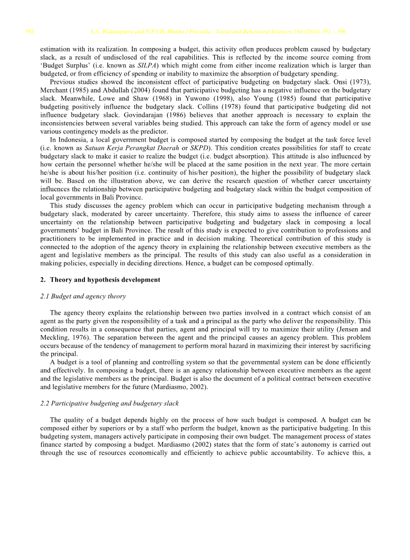 以前的研究表明,参与式预算对预算松弛的影响不一致。Onsi(1973),Merchant(1985)和Abdullah(2004)发现参与式预算对预算松弛有负面影响。与此同时,Lowe和Shaw(1968)、Yuwono(1998)和Young(1985)发现参与性预算对预算松弛产生积极影响。柯林斯(Collins,1978)发现参与式预算并不影响预算松弛。Govindarajan(1986)认为,需要另一种方法来解释正在研究的几个变量之间的不一致性。这种方法可以采取代理模型的形式,或使用各种权变模型作为预测因子。