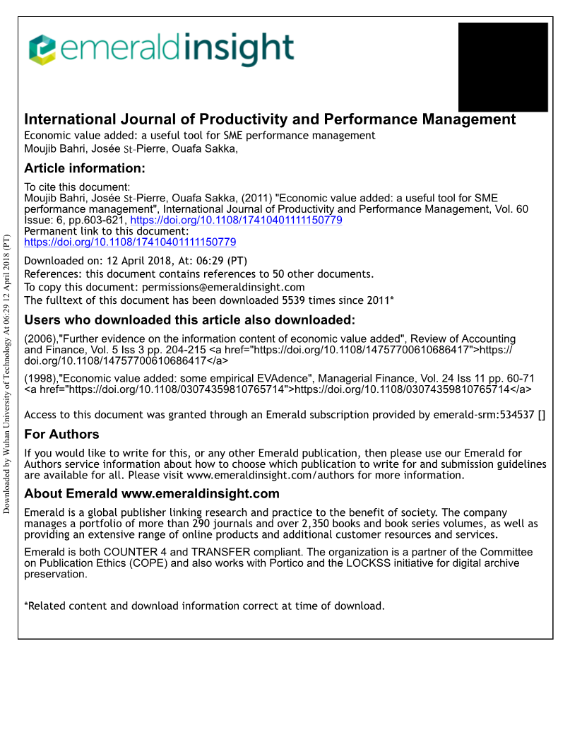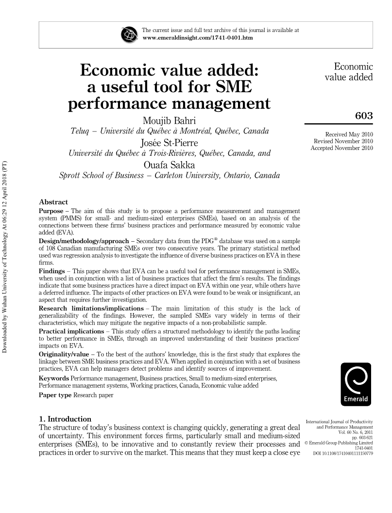 今天商业环境的结构正在迅速变化, 产生了大量的不确定性。这种环境迫使企业, 特别是中小型企业, 要创新, 不断审查其过程和做法, 以便在市场上生存。这意味着他们必须密切注意自己的表现 (Kennerley 和尼利, 2003;雷蒙德等, 2009;Cocca andAlberti, 2010)。然而, 很少有业绩计量和管理系统 (以便进一步) 适用于中小型企业,它们通常的特点是资源有限,缺乏管理专长(Garengo 等, 2005)。绩效管理工具相对短缺,加之普遍存在的环境不确定性和复杂性, 使企业难以控制和引导公司走向正确的方向。虽然最初是为大型企业开发的, 但我们认为, 经济价值的增加可以作为一个适当的出发点,为中小企业发展一个平衡和易于使用的以便进一步。正如 Brem(2008)指出的那样,很少有研究介绍中小企业的绩效测评系统。这项探索性研究的目的是要表明, 当 EVA 相关的财务信息与公司的商业惯例的非财务信息相结合时, 就有可能获得适合中小企业具体需求的以便进一步。我们的研究表明, 中小企业的商业行为与EVA 所衡量的绩效之间存在着关系, 尽管过去很少有作者考虑过这种联系。