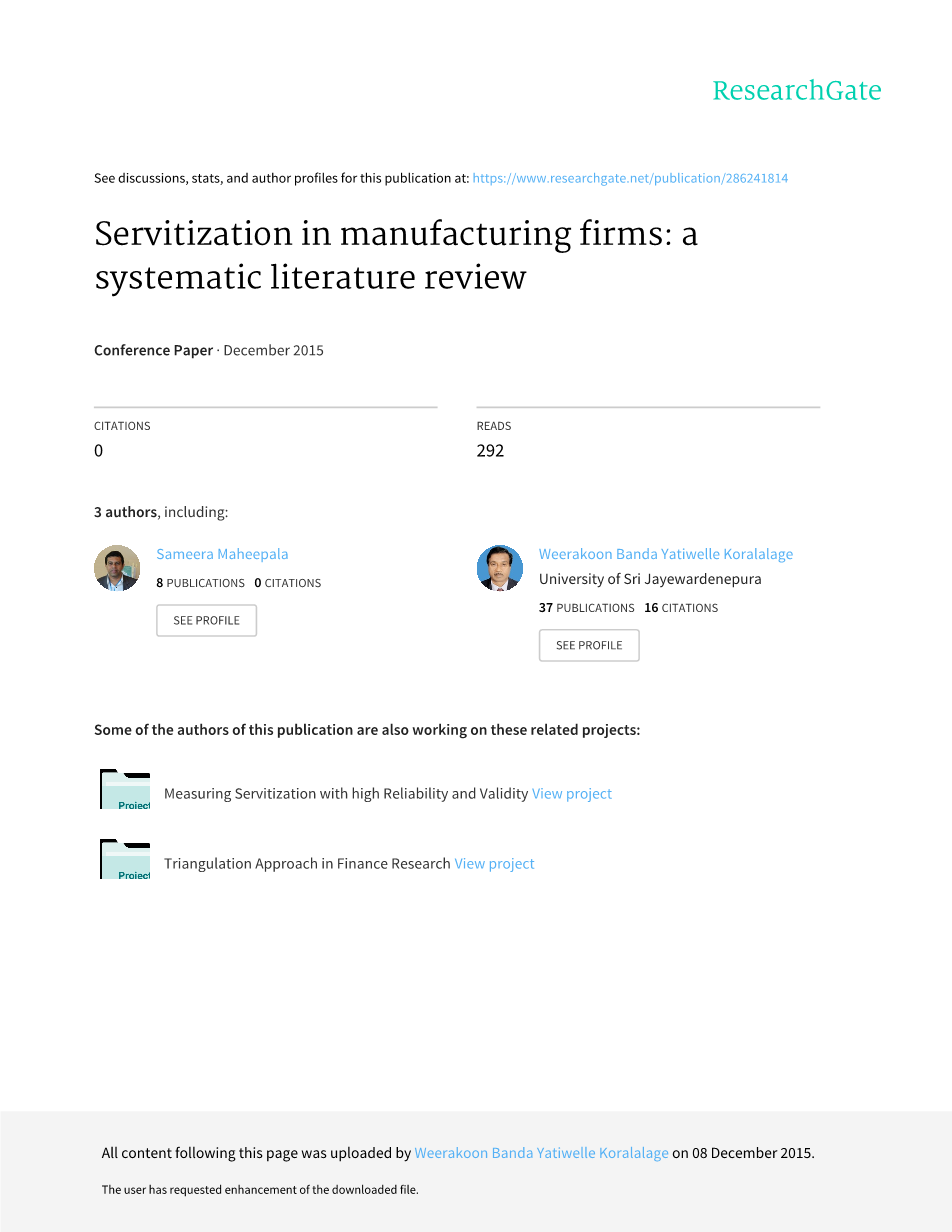 设计方法:作者对制造业服务领域的研究文献进行了系统的回顾。最初使用SSRN,JSTOR,Emerald,Taylor&Francis,Wiley在线,ScienceDirect,ResearchGate,与本研究相关。选取115篇文献共40篇与已确定的关键主题相关的出版物进行深入研究。对所选文章进行深入研究并进行专题分析。本文报道了服务化的关键主题。