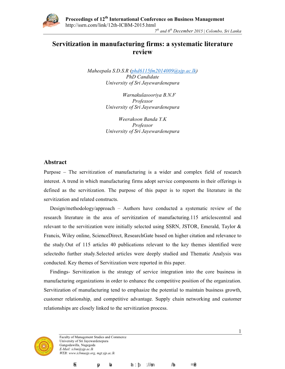 阿伯丁集团,通用汽车公司,IBM,罗尔斯·罗伊斯航空公司,英国石油公司,壳牌笑乐公司,波音公司,施乐公司等都通过服务化取得了成功。(Baumgartner,1999;Cohen等人,2006;Neely,2008)。发展中国家的服务化努力的研究较少。然而,为了在竞争激烈的市场中竞争,在地区和地方背景下有服务的趋势。斯里兰卡服装制造业有一些众所周知的案例,根据买方的要求提供研发,采购,设计,培训和其他独家服务。最近的创新实例可以被认为是由联合化学家在药房和医疗设备的汽车电池部门和送货上门服务市场领导者的Battmobile服务。在Battmobile提供一个由训练有素的技术人员组成的移动服务部门,他们将来到现场解决电池故障,无论他们使用哪个品牌(Brownsgroup.com,2015)。在药店的例子中,处方药免费送到客户所在地(Unionchemists.com,2015)。Vandermerwe和Rada(1988)提出了“服务化”这一术语来指导制造商在商品和服务结合上的努力,以便为核心产品提供附加价值。他们进一步解释说,几乎所有行业都在全球范围引入服务化,它涉及到不同的战略重点,组织复杂程度和传统管理配方不再适合的顺序。“制造企业向服务化转型不止商业模式的创新,也是经济格局的全球转型”(Li et al,2015,p.66)。