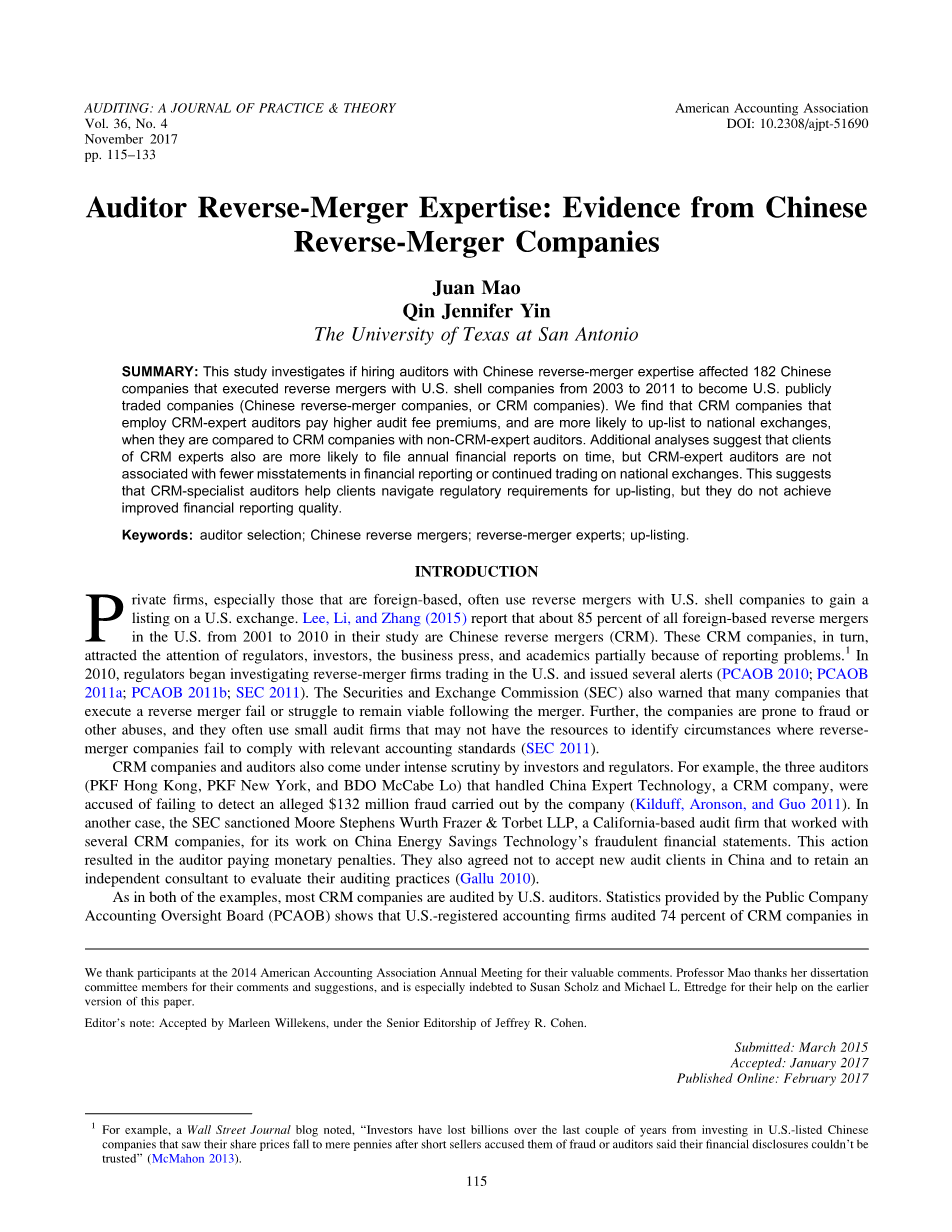 私人公司,特别是那些外国公司,往往与美国的空壳公司进行反向兼并,以在美国交易所上市。 Lee,Li和Zhang(2015)报告称,2001至2010年间美国所有外国反向收购案中约85%是中国反向并购(CRM)。这些CRM公司反过来也引起了监管机构,投资者,商业媒体和学术界的关注,部分原因是报告问题。 2010年,监管机构开始调查在美国进行交易的反向并购公司,并发布了多项警报。美国证券交易委员会(SEC)也警告说,许多执行反向并购的公司在合并后失败或难以保持可行性。此外,这些公司很容易出现欺诈或其他滥用行为,他们经常使用小型审计公司,这些公司可能没有资源来确定逆向整合公司未能遵守相关会计准则(SEC 2011)的情况。
