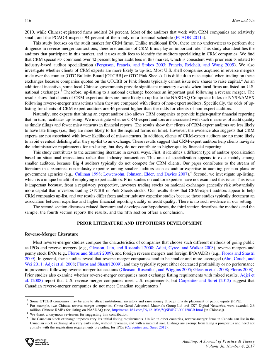 本研究的重点是CRM公司的审计市场。与传统的ipo不同,在反向合并交易中,没有承销商进行尽职调查;因此,客户关系管理公司的审计人员发挥着重要的作用。该研究还确定了参与这个市场的审计人员,并使用审计费用来确定专门从事CRM公司的审计人员。我们发现,CRM专家在这个市场上的审计费用超过了42%,这与之前与行业审计师专业化相关的结果是一致的(Ferguson, Francis, and Stokes 2003;Francis, Reichelt和Wang 2005)。我们还会调查客户关系管理专家的客户是否更有可能上升。大多数美国空壳公司在反向合并交易中获得了场外交易(OTC Bulletin Board [OTCBB]或OTC Pink Sheets)。在这些交易所进行交易时,很难筹集资金,因为在OTCBB或粉单上上市的公司通常不能发行新股来筹集资金。作为额外的奖励,一些地方政府在美国国家交易所上市时提供了巨额的货币奖励。因此,在反向合并后,在全国交易所上市成为一个重要的目标。研究结果显示,与非专业审计师的客户相比,在反向合并交易中,CRM专家审计师的客户更有可能向纳斯达克综合指数(NASDAQ Composite Index)或纽约证交所/美国证券交易所(NYSE/AMEX)进行反向合并交易。具体来说,CRM专家审计师的客户上表的几率比非专业审计师的客户高出46%。