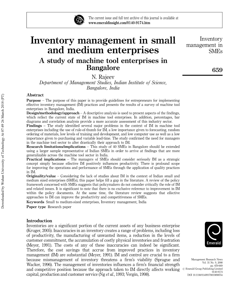 本文采用的研究方法主要是描述性分析,阐述了班加罗尔机床中小企业的基本特征,突出了库存和材料成本在总产出中的份额,介绍了IM的现状,探讨了IM的应用实践,提出了库存低的原因。通过相关分析,确定了库存绩效(由库存周转率(ITR)获取)与影响企业IM绩效的其他变量之间的关系。确定了一些重要IM活动的平均实践水平,最后对班加罗尔机床中小企业IM的实施范围进行了回顾。