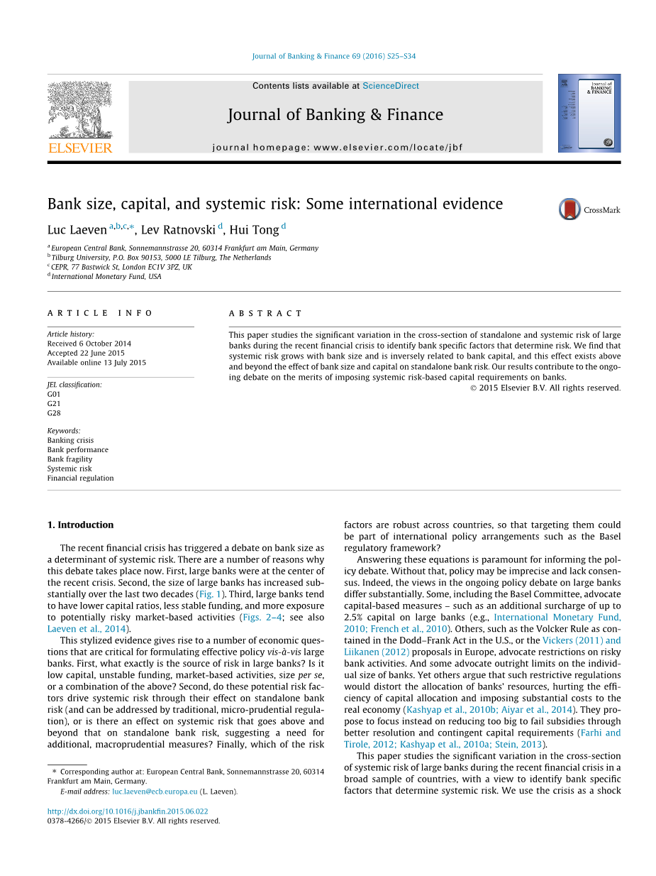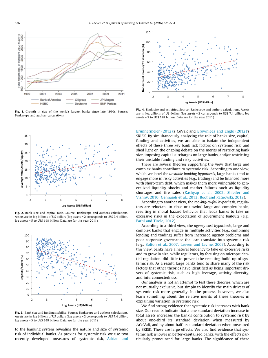 最近的金融危机引发了一场关于银行规模作为系统性风险决定因素的争论。这次争论现在有多种原因。首先,大型银行处于最近危机的核心;其次,在过去二十年内大型银行规模大幅增加(见图1);第三,大型银行资本率趋于下降,更少的稳定资金,以及更有可能面临机遇市场活动的潜在风险(见图2-4,同样适用于Laeven等人,2014)。