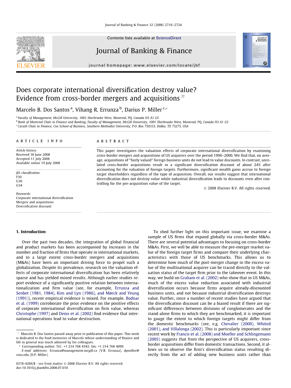 笔者在1990-1999年期间研究了涉及美国境外目标公司收购者的136项跨境并购。研究没有发现美国收购公司在收购两年期间的平均超额价值显着下降的证据。研究中使用了与Bodnar等人(1999)和Denis等人(2002)相同的估值方法,它代表了Berger和Ofek(1995)最初开发的行业匹配乘数法。估值分析还表明,平均而言,国外目标企业作为独立公司在其上一期的折价或溢价中的价值并不显着。总而言之,研究结果表明,跨境收购行为不会导致任何国际多元化价值受损。