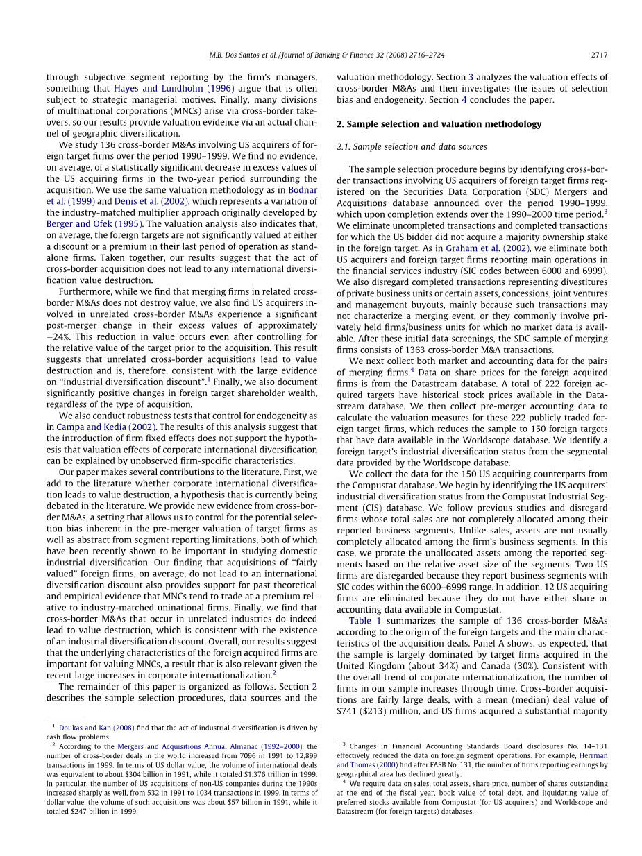 样本选择程序首先确定跨国交易,涉及在1990-1999期间宣布的证券数据公司(SDC)兼并和收购数据库中,注册的国外目标公司的美国收购者的跨境交易,该数据库完成时间跨越1990-2000年期间[3]。本文样本剔除了未完成的交易和完成的交易,因为美国竞标者并未获得国外目标公司的多数股权。与Graham等人(2002年)处理相同,本文剔除了以报道金融服务行业为主要业务的美国收购者和国外目标公司(SIC代码在6000到6999之间)。样本同时也剔除来代表私人企业或某些资产、特许权、合资企业和管理层收购的完成交易,主要是因为此类交易可能不是合并事件的特征,或者它们通常没有可用的市场数据。