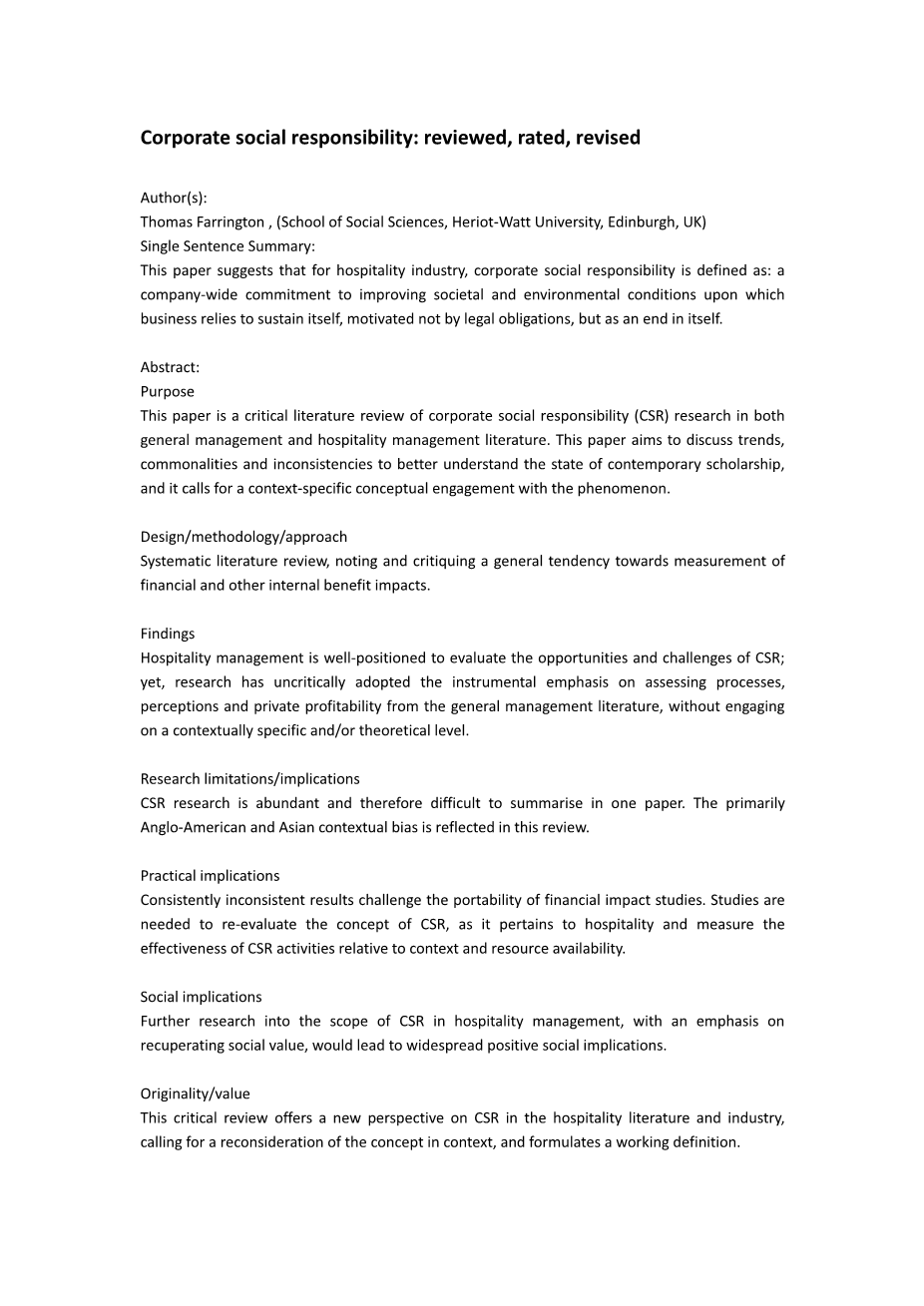 尽管如此,企业社会责任已经被概念化和以一种往往不连贯,经验不一致的方式被应用,而且往往得出一个有限的,矛盾的结果(Van Beurden andGouml;ssling,2008; Lindgreen and Swaen,2010; Pope andWaelig;raas,2015; Rangan et al。2015年)。这种不一致性的部分原因在于一个商定的总体定义难以捉摸(Carroll,1999; Dahlsrud,2008),可能是由于其复杂的演化路径,其特点是包括利益相关者,管理权和代理理论在内的影响。因此,企业社会责任在管理文献中的看法差异很大,Lindgreen和Swaen(2010,p.1)声称这“可能阻碍管理者对CSR应该包含的内容的完全理解并阻碍CSR的进一步理论发展”。尽管如此,与酒店调研一样,企业社会责任的话语从审视伦理基础,宏观层面的争论,转向以组织为重点,与绩效相关的分析(李,2008;诺兰德和菲利普斯,2010)。