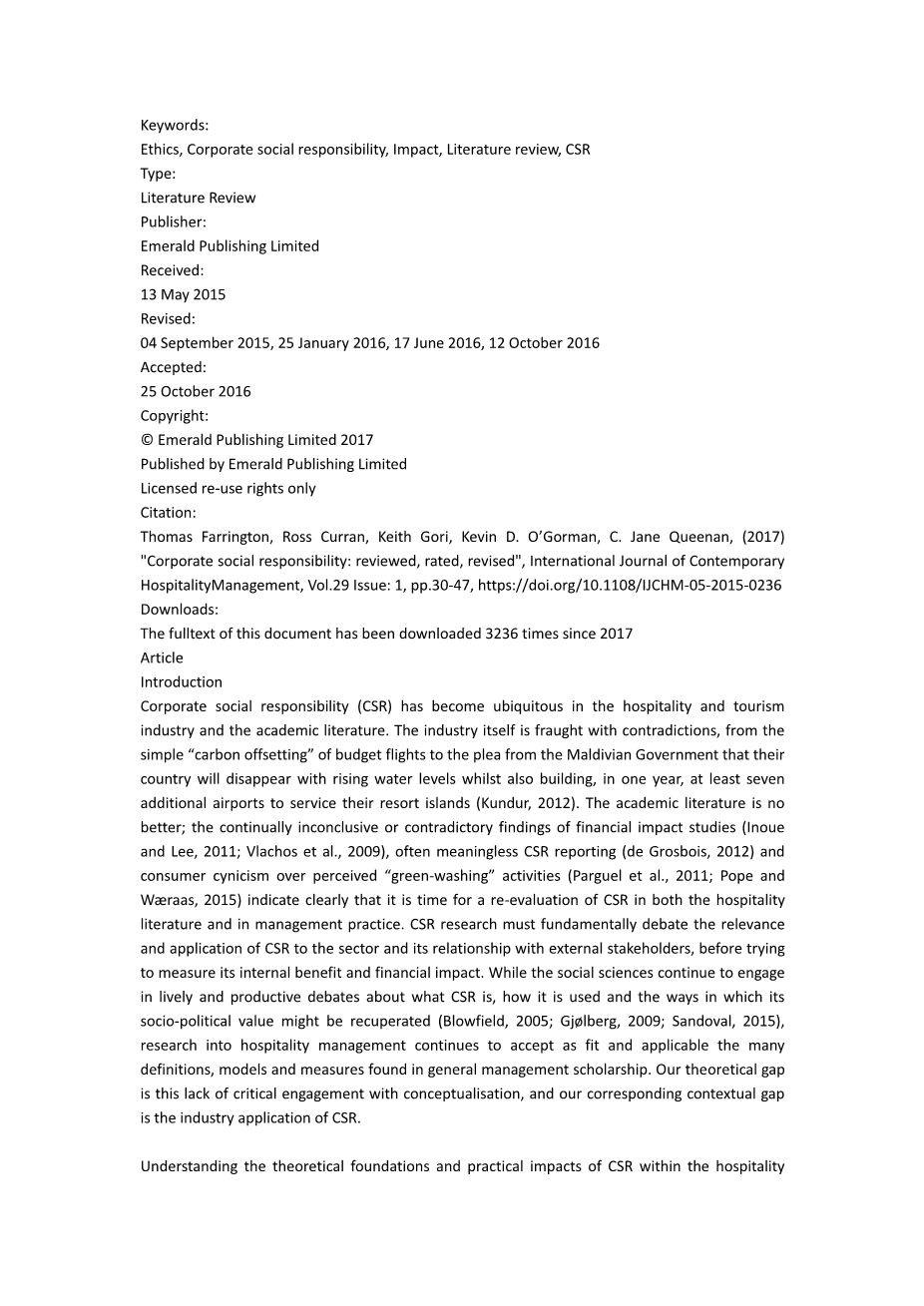 企业社会责任(CSR)在酒店旅游业和学术文献中无处不在。这个行业本身充满了矛盾,从简单的廉价航班的“碳补偿”到马尔代夫政府的呼吁,他们的国家将随着水位的上升而消失,同时还在一年内建造至少七个额外的机场度假岛屿(Kundur,2012)。学术文献也是如此;金融影响研究(Inoue和Lee,2011; Vlachos等,2009),常常无意义的CSR报告(de Grosbois,2012)和消费者对感知到的“绿色洗钱”活动的犬儒主义持续不确定或矛盾的研究结果(Parguel et al。2011; Pope andWaelig;raas,2015)清楚地表明,现在是在酒店文学和管理实践中重新评估企业社会责任的时候了。企业社会责任研究必须在试图衡量其内部收益和财务影响之前,从根本上讨论企业社会责任对该部门及其与外部利益相关者的关系的相关性和应用。虽然社会科学继续参与到关于企业社会责任是什么,它是如何使用的以及它的社会政治价值可能得到恢复的方式这样的生动和富有成效的辩论中(Blowfield,2005;Gjoslash;lberg,2009; Sandoval,2015),研究酒店管理部门继续接受一般管理学术中的许多定义,模式和措施。我们理论上的差距在于缺乏对概念化的关键参与,而我们相应的背景差距是CSR的行业应用。