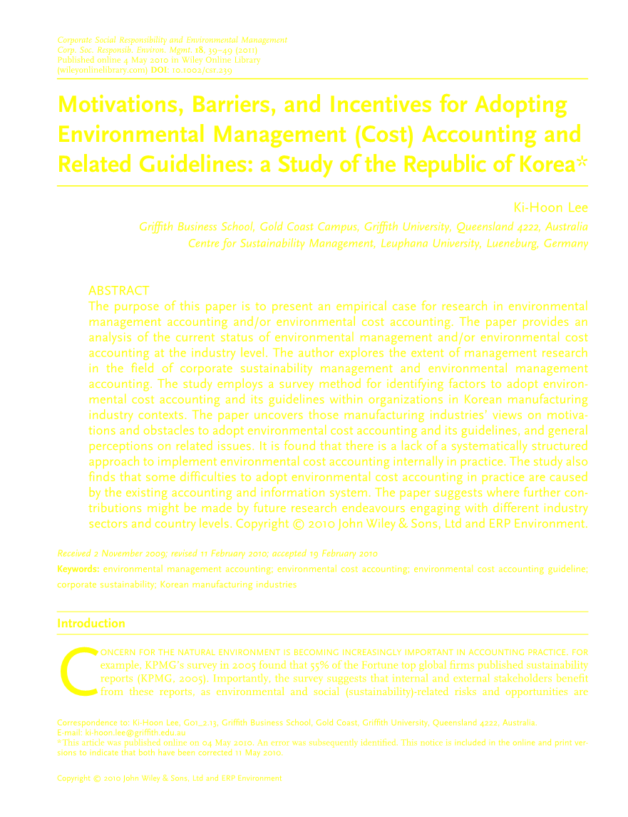 采取环境管理(成本)会计的动机、障碍和激励以及相关的准则(guidelines):一份针对南韩的研究