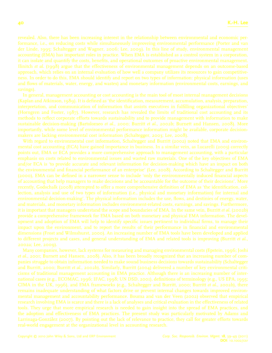 考虑到自然环境在会计实务中正变得越来越重要,例如,毕马威在2005年的调查中发现55%的《财富》全球顶级企业都会发布可持续性报告(KPMG,2005)。更重要的是,调查表明内部及外部利益相关者都受益于这些报告,因为其中揭示了环境性和社会(可持续)性的风险、机遇。此外,人们对环境和经济绩效之间的关系也越来越感兴趣,也就是说,在降低成本同时提高环境效益(Porter and vander Linde, 1995; Schaltegger and Wagner, 2006; Lee, 2009)。在这一系列的研究中,环境管理会计在实践中起着重要的作用。当环境管理会计作为一家公司的控制系统建立时,它可以隔离并量化前瞻性的环境管理的成本、效益和业务成果。Ilinitch 等人(1998)认为环境管理的有效性取决于基于成果的方法,该方法依靠于公司利用资源获得竞争力能力优劣的内部评估。为达到这一点,环境管理会计应当识别并报导两种信息:物质信息(材料、水、能源和废物的使用和流动)和货币信息(环境成本、收益和储蓄)。