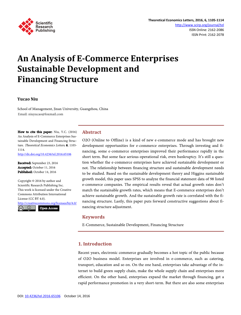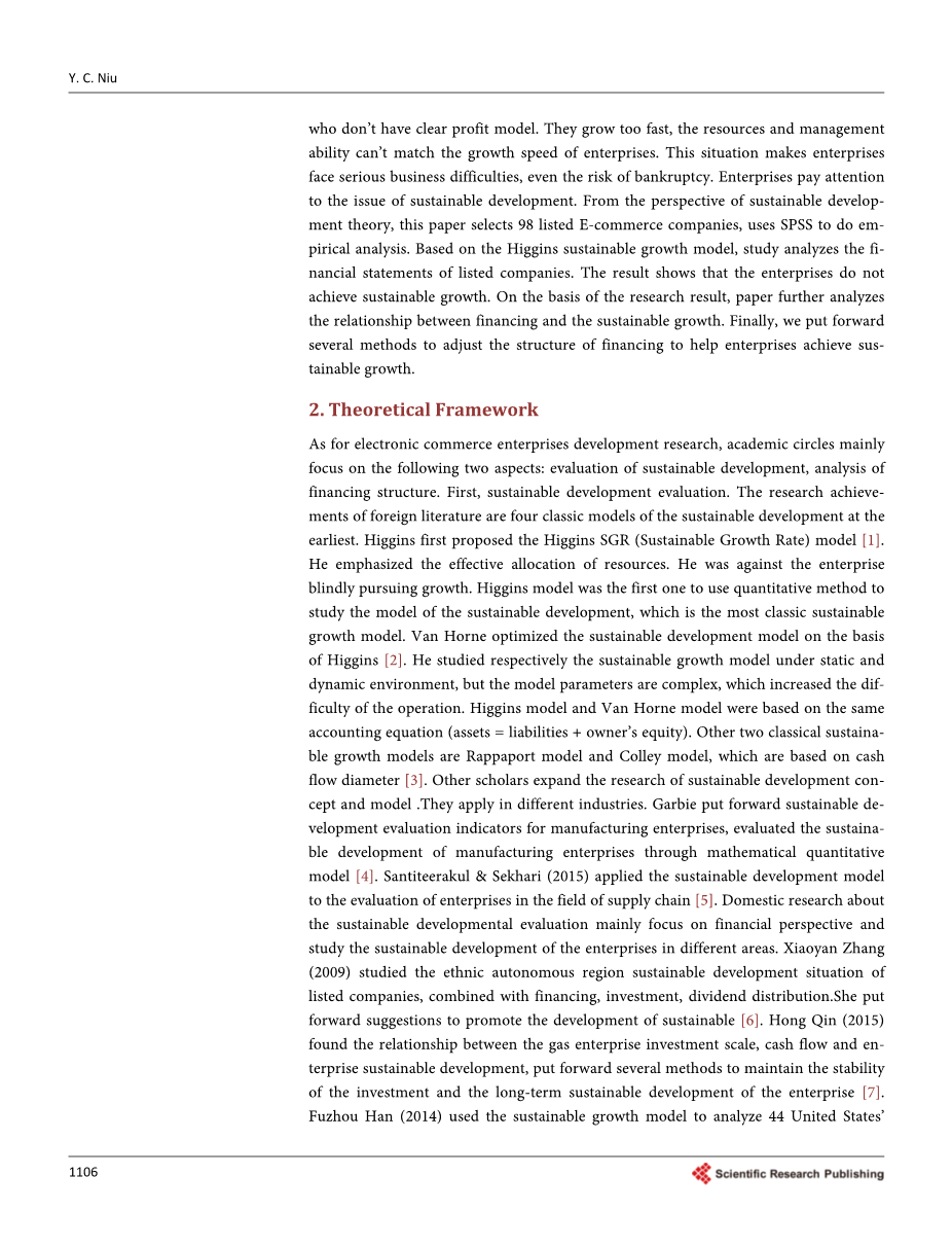 在电子商务企业发展研究方面,学术界主要集中在以下两个方面:可持续发展评估,融资结构分析。一是可持续发展评估。国外文学的研究成果最早是可持续发展的四种典型模式。 Higgins首先提出了Higgins SGR(可持续增长率)模型[1]。他强调资源的有效配置。他反对企业盲目追求增长。希金斯模型是第一个用定量方法研究可持续发展模型的模型,这是最经典的可持续增长模型。 Van Horne在Higgins的基础上优化了可持续发展模型[2]。他分别研究了静态和动态环境下的可持续增长模型,但模型参数复杂,增加了操作难度。希金斯模型和范霍恩模型基于相同的会计等式(资产=负债 所有者权益)。其他两种经典的可持续增长模型是基于现金流量直径的Rappaport模型和Colley模型[3]。其他学者对可持续发展的概念和模式进行了研究。它们适用于不同的行业。 Garbie提出制造企业可持续发展评价指标,通过数学定量模型对制造企业的可持续发展进行评价[4]。 Santiteerakul&Sekhari(2015)将可持续发展模型应用于供应链领域的企业评估[5]。国内关于可持续发展评价的研究主要集中在财务视角,研究不同地区企业的可持续发展。张小燕(2009)研究了民族自治地区上市公司可持续发展状况,并结合融资,投资,股利分配等方面提出了促进可持续发展的建议[6]。洪勤(2015)发现燃气企业投资规模,现金流量与企业可持续发展之间的关系,提出了维持投资稳定性和企业长期可持续发展的几种方法[7]。福州汉(2014)采用可持续增长模型分析了2008 - 2012年间44家美国上市电子商务公司[8]。财务数据显示企业未实现可持续增长。他提出融资,利润等因素影响企业的可持续发展。但他没有做进一步的实证检验。现有文献研究涵盖生物制药,煤炭,信息技术等行业企业。