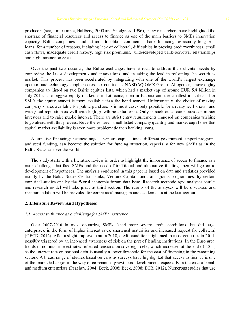 与大企业相比,2008-2009年的金融危机以较高利率、缩短到期日及增加抵押品的形式,对中小企业外部融资的有效性的影响更为显著。因此,现在获得融资是中小企业企业家面临的最大挑战之一。在波罗的海国家,中小企业是公司的最大组成部分,提供了大部分的就业机会。然而,中小型企业通常遵循“利基战略”,采用高品质、灵活性和响应顾客需求作为与大规模生产者竞争的手段(参见,例如,哈尔伯格,2000和斯诺得格拉斯,1996),许多研究人员着重指出,金融资源短缺和获取融资是中小企业创新能力的主要障碍之一。波罗的海公司很难获得商业银行融资,特别是长期贷款,原因有很多,其中包括缺乏抵押品,难以证明信誉,现金流量小,信贷历史不足,风险溢价高,银行借款人关系不发达以及交易成本高。
