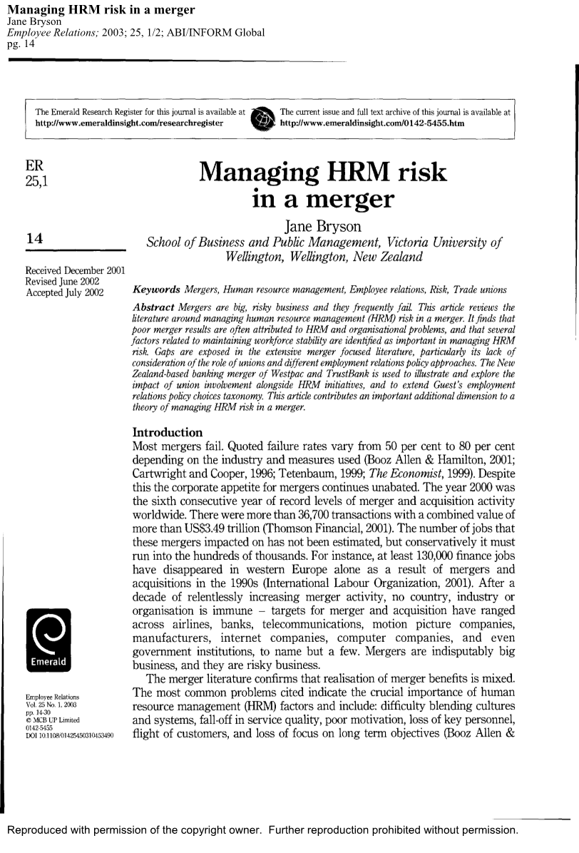 合并是巨大而危险的业务,而且经常失败。 本文回顾关于合并中管理人力资源管理(HRM)风险的文献。 它发现,不合格的合并结果通常归因于人力资源管理和组织问题,而且与维护员工稳定性相关的几个因素被认为是管理人力资源管理风险的重要因素。 在广泛合并的文献中,特别是缺乏对工会作用和不同雇佣关系政策方法的考虑,暴露出了差距。 西太平洋银行与TrustBank的新西兰银行合并用于说明和探讨工会参与人力资源管理举措的影响,并扩展Guest的雇佣关系政策选择分类。 本文为合并中管理人力资源管理风险的理论提供了重要的附加维度。