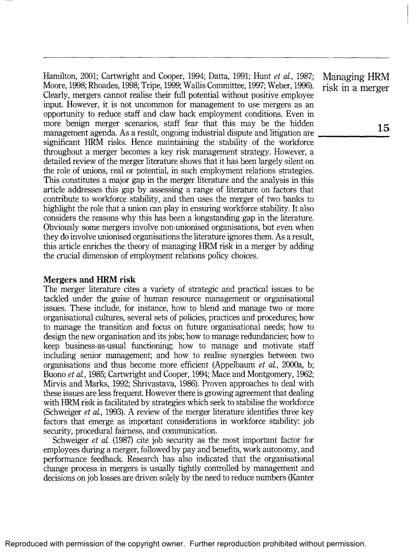 大多数合并失败。被引用的失败率从50%到80%不等,这取决于所使用的行业和措施(Booz Allen&Hamilton,2001; Cartwright and Cooper,1996; Tetenbaum,1999; The Economist,1999)。尽管如此,企业并购的胃口仍然不减。 2000年是全球并购活动创历史新高的连续第六年。交易额超过36,700笔,总价值超过3.49万亿美元(Thomson Financial,2001)。这些兼并所影响的工作数量尚未估算,但保守地说它必须达到数十万。例如,由于90年代的兼并和收购,仅西欧至少有13万个金融工作岗位已经消失(国际劳工组织,2001年)。在经历了十年无情增长的合并活动之后,没有任何一个国家,行业或组织成为免疫企业,并购的目标包括航空公司,银行,电信,电影公司,制造商,互联网公司,电脑公司,甚至政府机构等。名字但少数。合并是无可争议的大生意,而且它们是危险的业务。合并文献证实合并利益的实现是混合的。引用的最常见问题表明人力资源管理(HRM)因素至关重要,包括:融合文化和系统的困难,服务质量下降,动机不佳,关键人员流失,客户流失以及失去重点长期目标(Booz Allen&Hamilton,2001; Cartwright和Cooper,1994; Datta,1991; Hunt等,1987;穆尔,1998;罗兹,1998; Tripe,1999;瓦利斯委员会,1997年;韦伯,1996年)。显然,没有积极的员工投入,兼并就无法实现其全部潜力。然而,管理层将兼并作为减少员工和回扣就业条件的机会并不少见。即使在更温和的合并情景中,员工也担心这可能是隐藏的管理议程。因此,持续的工业争议和诉讼是人力资源管理的重大风险。因此,在整个合并过程中保持劳动力的稳定性,成为一项重要的风险管理策略。然而,对合并文献的详细回顾表明,对于这种雇佣关系战略中真正或潜在的工会的作用,它基本上没有提及。这构成了合并文献中的一个重大缺口,本文的分析通过评估一系列有助于稳定劳动力的因素的文献来解决这一差距,然后使用两家银行的合并来强调工会可以在确保劳动力稳定。它也认为这是文献中长期存在的差距的原因。很显然,一些兼并涉及非工会组织,但即使他们确实涉及工会组织,文献也会忽视这些组织。因此,本文通过增加就业关系政策选择的关键维度,丰富了合并中管理人力资源管理风险的理论。