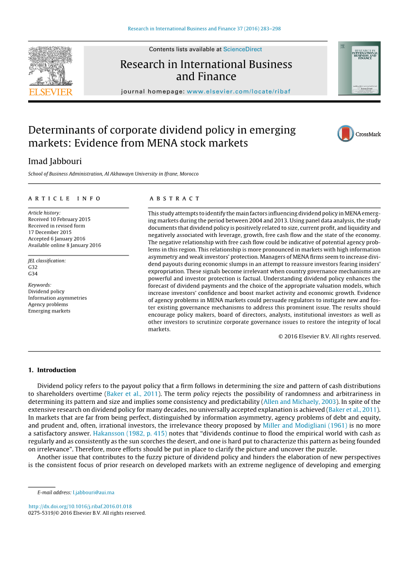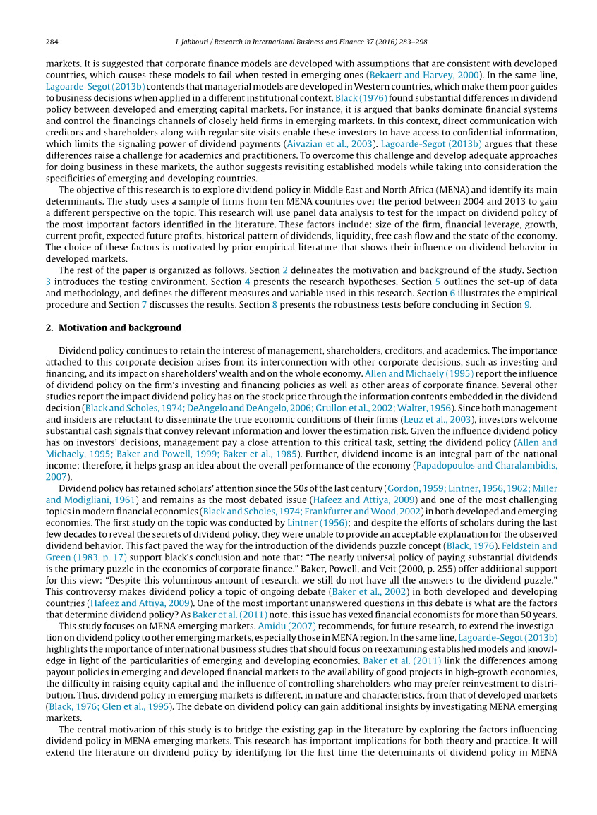 本研究的重点是MENA新兴市场。Amidu(2007)建议未来的研究对股利政策的调查扩展到其他新兴市场,特别是中东地区的新兴市场。在同一行中,Lagoarde-Segot (2013b)强调了国际商业研究的重要性,这些研究应该侧重于根据新兴和发展中经济体的特殊性重新审查已建立的模型和知识。Baker等人(2011)将新兴市场和发达金融市场的支付政策的差异与高增长经济体的优秀项目的可用性、筹集股本的难度以及控股股东的影响联系起来,后者可能更倾向于再投资而非分销。因此,新兴市场的股利政策在性质和特征上不同于发达市场(Black, 1976;格伦et al .,1995)。关于股利政策的辩论可以通过调查MENA新兴市场获得更多的见解。本研究的重点是MENA新兴市场。Amidu(2007)建议未来的研究,将对股利政策的调查扩展到其他新兴市场,特别是中东地区的新兴市场。在同一行中,Lagoarde-Segot (2013b)强调了国际商业研究的重要性,这些研究应该侧重于根据新兴和发展中经济体的特殊性重新审查已建立的模型和知识。Baker等人(2011)将新兴市场和发达金融市场的支付政策的差异与高增长经济体的优秀项目的可用性、筹集股本的难度以及控股股东的影响联系起来,后者可能更倾向于再投资而非分销。因此,新兴市场的股利政策在性质和特征上不同于发达市场(Black, 1976;格伦et al .,1995)。关于股利政策的辩论可以通过调查MENA新兴市场获得更多的见解。