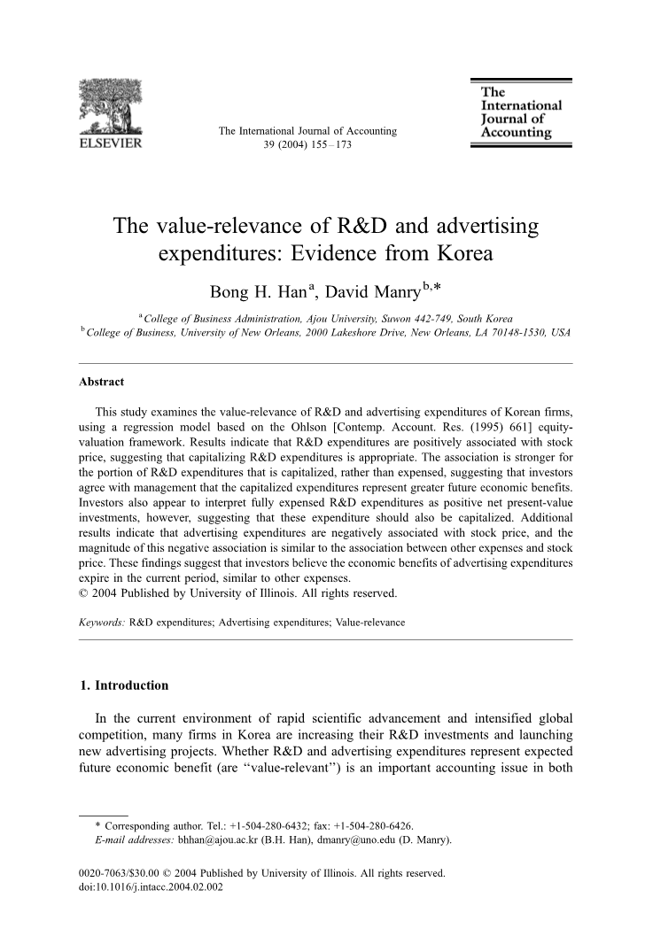 The financial press has been critical of various Korean accounting practices, including the capitalization of amounts that do not represent future benefits (Ehrlich amp; Mann, 1998). Ramp;D investments and advertising activities are essential for securing a firmrsquo;s technological superiority and enhancing its brand values. Our findings on the information content of Ramp;D and advertising expenditures may prove useful in future deliberations about, on modifying current accounting standards that govern the extent to which these expenditures should be capitalized.