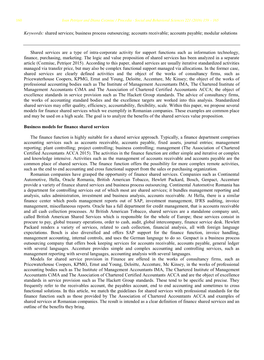 为应收账款管理提供共享服务涉及多个职能领域和责任维度。 就这种共享服务业务而言,规模和标准化是有利的。 共享服务部门的目标是增强管理应收账款的能力。 信用管理有专业的指导方针,如英国信用管理学院和哈克特集团的标准。 应收账款管理流程涉及零不确定性,并受程序约束。 如果这些程序是世界级的,该单位将提供最优质的共享服务。 在一个专门的地点组织应收帐款的管理可以产生效率,产生效率的方式有学习经济、过程改进、消除闲置时间、降低人员成本的潜力。 这些活动的内容通过服务水平协议(Cozmiuc; Petrisor 2015)进行管理,因此可由客户控制并由卖方负责。 然而,所提供的服务量是无限的,因此客户可以根据需要灵活地购买尽可能多的服务,而不是承担固定成本。 这使客户能够专注于核心活动。 实际上,我们已经找到了几种管理应收帐款共享服务的方法:如不同的流程(例如大陆汽车,海拉); 作为高规模的标准化流程(例如简柏特); 作为全面的跨职能解决方案(甲骨文,惠普,英美服务,保理机构)。 只有后两者从组织效率中受益。 由于与应收账款相关的主题涵盖了多个功能领域,就共享服务而言,优化了组织活动模块并为客户提供完整的解决方案。 它将在销售和现金收集组织中创建类似的基于活动的成本计算效率和学习效果。 像简柏特这样的组织聘请业务运营专业人士来优化业务涉及的流程。 在简柏特,应收帐款管理流程是用客户语言进行管理的。 共享服务有可能以整个公司或一个地区组织成一个整体,这意味着它们有可能成为一个高规模的活动。 罗马尼亚长期提供共享服务客户所寻求的利益,因此可能成为进一步研究的对象,作为共享服务的合适地点。