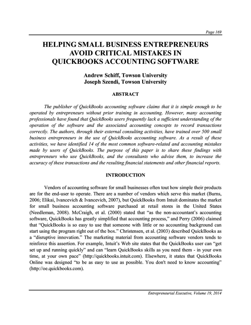 QuickBooks会计软件的发行人声称,这是一款操作足够简单,企业家不需要特意训练就可以掌握的软件。然而,很多会计专家发现QuickBooks的使用者经常缺乏对软件操作的充分理解,也不能正确地了解有关交易记录的相关会计概念。因此软件的发起人通过他们的外部咨询活动,对超过五百个小型企业家进行了QuickBooks会计软件的操作训练。通过这些活动,我们发现了14个QuickBooks用户最容易产生的会计软件相关的错误。这篇文章的目的就是为了分享有关QuickBooks的企业使用者和建议顾问的发现,以此来提高交易准确性和财务报表以及其他财务报告的准确性。