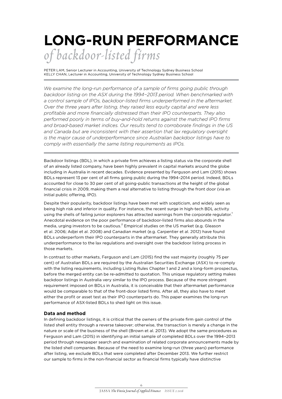 与其他市场相比,Ferguson和Lam(2015)发现澳大利亚证券交易所(ASX)要求绝大多数(大约75%)的澳大利亚借壳上市企业在合并后的实体可以重新允许报价前需要符合上市要求,包括上市规则第一章和第二章,以及签署一份长期的招股说明书。这种独特的监管设置使澳大利亚的借壳上市与IPO过程非常相似。由于澳大利亚对借壳上市的要求更加严格,可以想象,他们的二级市场表现将会与IPO上市公司的业绩相媲美,毕竟,他们也必须像他们的IPO同行一样,满足利润或资产测试的要求。本文研究了ASX上市的借壳上市的长期性能,以阐明该问题。