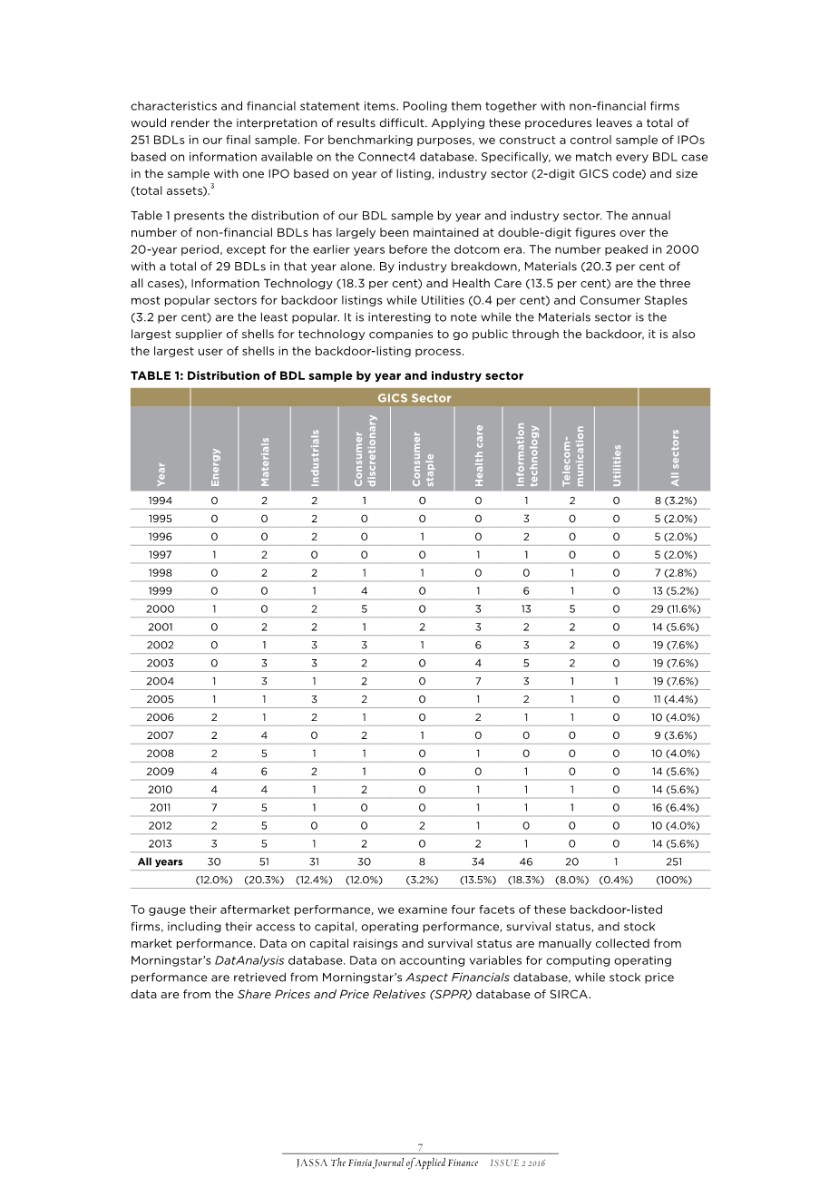 在定义借壳上市时,关键是私营公司的所有者通过反向收购获得上市壳公司的控制权,否则,交易仅仅是壳公司业务性质或规模的改变(Brown et al. 2013)。我们采用了与Ferguson 和 Lam(2015)相同的程序,通过报纸搜索和审查在1994年到2013年期间借壳上市公司的公告,确定了完整的借壳上市样本。由于需要审查上市后的长期(三年)业绩,我们排除了在2013年12月之后完成的借壳上市样本。我们进一步将样本限制在非金融领域的公司,因为金融公司通常具有鲜明的特征和财务报表项目,假如将它们与非金融企业联合在一起,将很难解释结果。在我们的最终样本中,应用这些程序总共会留下251个借壳上市企业样本。为了进行基准测试,我们根据Connect4数据库上的信息构建了一个IPO的控制样本。具体的说,我们根据上市年份、行业部门(2位数字GICS码)和规模(总资产),将每个借壳上市案例与首次公开上市(IPO)企业相匹配。