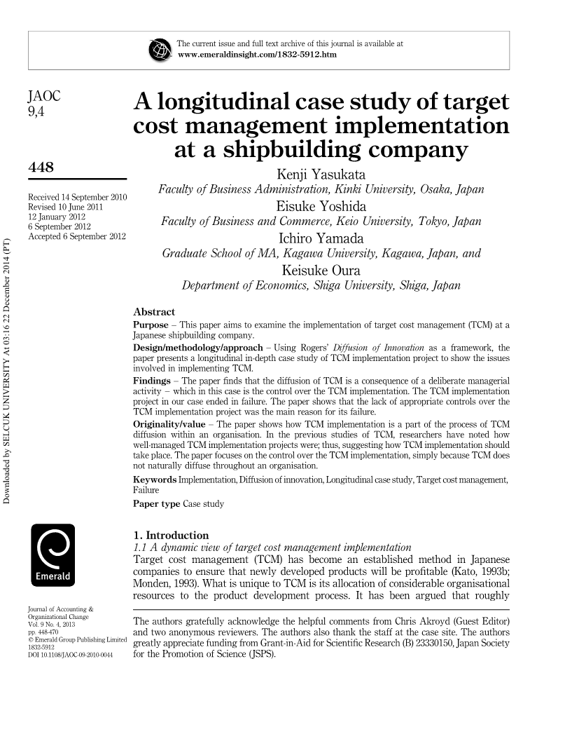 关键词:实施 创新扩散 纵向的案例研究 目标成本管理
