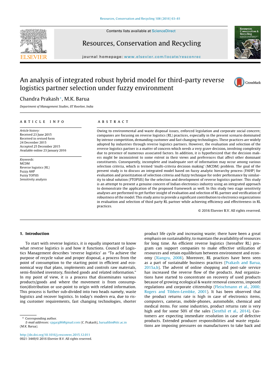 首先逆向物流,同样重要的是要知道什么逆向物流以及它是如何发挥作用。理事会家逻辑-抽动管理介绍了“逆向物流”为“要实现回收价值和妥善处置的目的,从消费在计划,执行和控制原材料高效和经济的方式点到起点的过程,半成品库存,成品及相关信息。“以我的观点,那就是传播各种产品/商品和一个过程,其中运动是从消费记录-化/分销或使用点来源与相关信息。这过程是进一步细分成两个磁头即,废物物流和回收物流。在今天的现代社会中,由于客户的要求不断提高,快速变化的技术,产品生命周期缩短,提高废物的;已经有一个非常注重可持续发展,保持资源的长期可用性。一个高效的逆向物流程序可以支持公司进行资源的有效利用和环境与经济(香茹,2008年)之间的平衡保留。此外,逆向物流的做法已经被视为可持续业务实践(普拉卡什和巴鲁阿,2015A,B)的一部分。网上购物和售后服务的出现,增加了产品的逆向流动。和组织都开始专心,因为不断增长的生态和垃圾处理的关注废旧产品回收,实行法规和企业公民(Fleischmann等人,2000; Rogers和Tibben-Lembke,2001)。已经观察该产品的回报率是在电子物品,计算机,照相机,移动电话,汽车,化学和医疗用品的情况下高。对于某些行业,产品回报率是非常高的,为销售额的50%(Senthil等,2014)。顾客期待的产品缺陷的情况下,立即解决。生产者延伸责任和废弃物法规对制造商强加的压力收回后正常使用年限(Prahinski和Kocabasoglu,2006)处理的产品。管理逆向物流操作是困难的,因为复合不确定时机,数量和退回产品的质量(Fleischmann等,1997)。而每次退货需要根据不同的条件各种治疗返回从恢复选项和妥善处置除了产品化。逆向物流活动是不是因此,传统供应链的运作更加复杂;企业需要灵活地处理业务问题。效益回报的管理实践可以提高客户满意度和服务水平。但是高效的回报需要专门的基础设施需求,推进IT和跟踪系统,专用设备收益的处理,以及训练有素的人力资源和其他增值服务。因此,许多组织那些缺乏资源和能力外包其逆向物流业务要求的第三方物流(Krumwiede和SHEU,2002)。此外,如果逆向物流操作不是组织核心功能的一部分,逆向物流活动可能外包给第三方。这个第三方逆向物流合作伙伴提供了降低成本,提高性能,运营效率,组织竞争力和更好的企业形象方面的好处。该第三方逆向物流合作伴侣有处理与同类产品收购/门保管,收集,检验及整理,保管,加工各种活动沿着产品回报灵活的容量。这些活动需要国家的最先进的基础设施,仓储设施,专用运输,物料输送设备的,熟练劳动力和定制化的信息系统来监控出货,而数据挖掘与支持。协调和合作伙伴的可靠性是非常重要的方面,而外包逆向物流操作。因此,第三方逆向物流合作伙伴选择过程已经成为一个重要的战略决策。