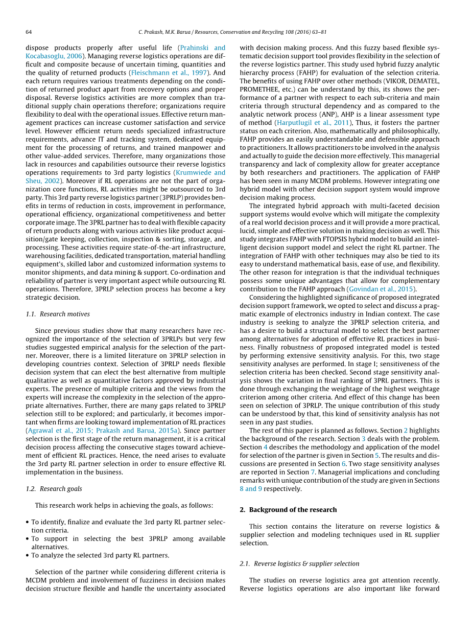 由于先前的研究表明,许多研究人员已经认识到第三方逆向物流合作伙伴的选择的重要性,但很少有研究建议对合作伙伴的选择实证分析。此外,还有对发展中国家环境第三方逆向物流合作伙伴选择有限的文献。第三方逆向物流合作伙伴的选择需要灵活的决策系统,可以选择多个定性以及由行业专家认可的定量因素的最佳替代品。多种标准和专家意见的存在会增加复杂性在适当的替代品的选择。此外,还有一些涉及到第三方逆向物流合作伙伴选择仍有待探讨了很多方面的差距;特别是,它在各家公司都望向实施逆向物流的做法就变得很重要(Agrawal等,2015年;普拉卡什和巴鲁阿,2015A)。由于合作伙伴的选择是回归管理的第一阶段,它是影响向着高效逆向物流实践成果的连续阶段的一个关键的决策过程。因此,在有需要时进行评估,以确保企业有效实施逆向物流第三方逆向物流合作伙伴的选择。