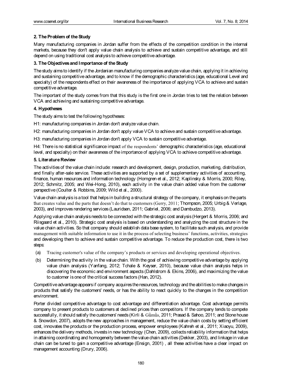 约旦的许多制造企业都受到内部市场竞争条件的影响,因为他们不运用价值链分析来获取和保持竞争优势,仍然依赖于采用传统的成本分析方法,以获取竞争优势。