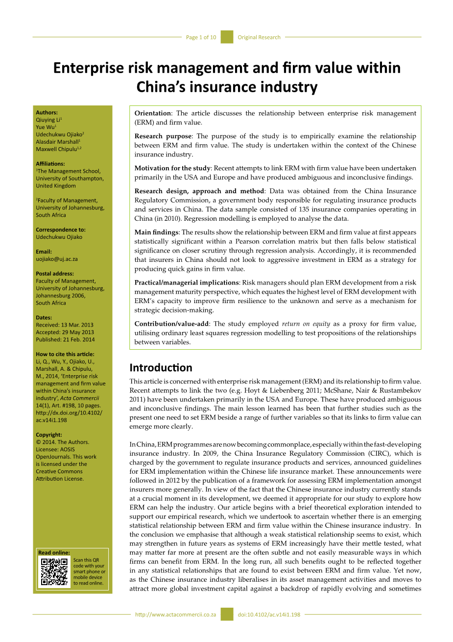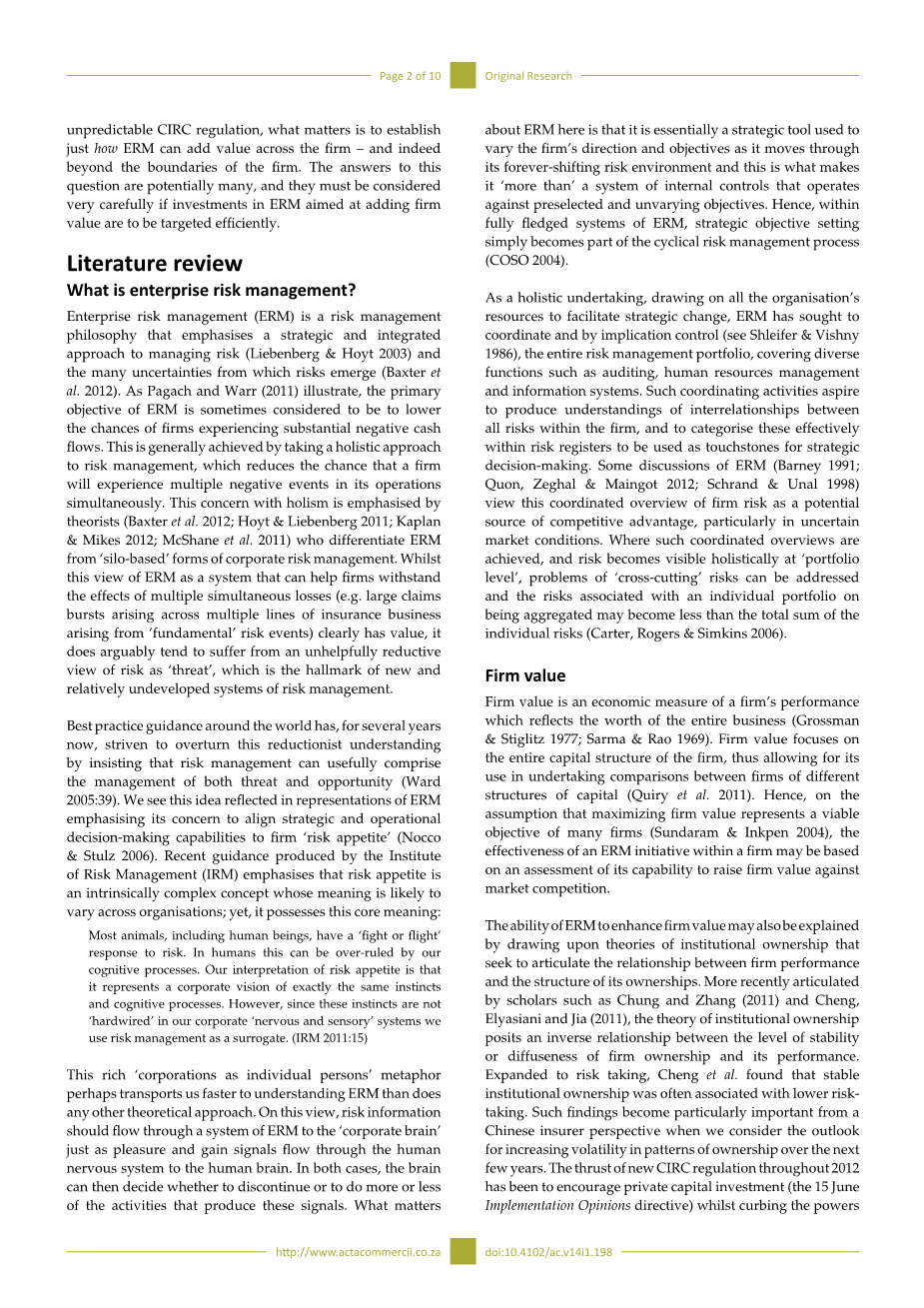 本文探讨企业风险管理及其与企业价值的关系。最近将两者联系起来的尝试主要在美国和欧洲进行(例如2011年Hoyt和Liebenberg; McShane, Nair和 Rustambekov)。这些都产生了模棱两可的结论。主要的经验教训是,像现在这样的进一步研究需要把企业风险管理放在一系列进一步的变量旁边,以便它与企业价值的联系能够更加清晰地显现出来。
