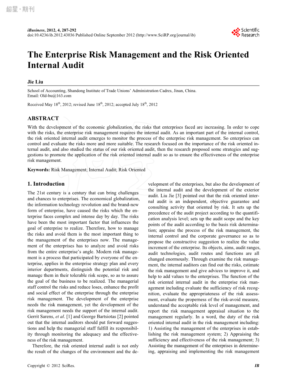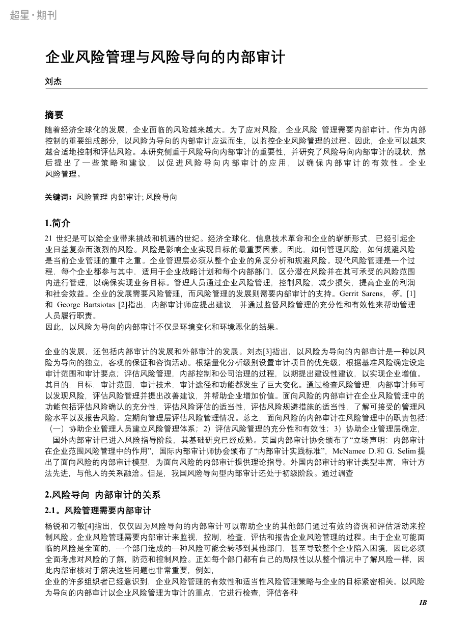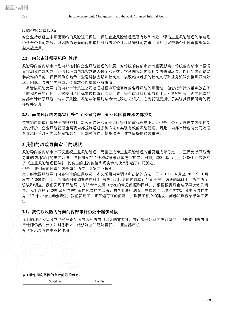 企业风险管理与风险导向的内部审计外文翻译资料 2022-08-05 11:34:04 英语原文共 6 页,剩余内容已隐藏,支付完成后下载完整资料 英语译文共 6 页,剩余内容已隐藏,支付完成后下载完整资料 资料编号:[262244],资料为PDF文档或Word文档,PDF文档可免费转换为Word 原文和译文剩余内容已隐藏,您需要先支付 30元 才能查看原文和译文全部内容!立即支付 发小红书推广免费获取该资料资格。点击链接进入获取推广文案即可: Ai一键组稿 | 降AI率 | 降重复率 | 论文一键排版 PREVIOUS NEXT 您可能感兴趣的文章 预算创新、信息质量和部门绩效外文翻译资料 印度信息技术行业财务分析 ——以威普罗和印孚瑟斯公司为例外文翻译资料 真实性与公司治理外文翻译资料 财产责任保险公司投资组合选择的决定因素外文翻译资料 失衡:中国财政联邦制的意外结果外文翻译资料 财务弹性是影响亚洲企业投资效率的因素之一外文翻译资料 风险管理在审计中的地位及其重要性外文翻译资料 杠杆和公司绩效:机构环境是否重要?外文翻译资料 印度尼西亚企业社会、环境与财务绩效之间的关系外文翻译资料 为中国纯电动公交行业(PEB) 发展新型商业模式外文翻译资料