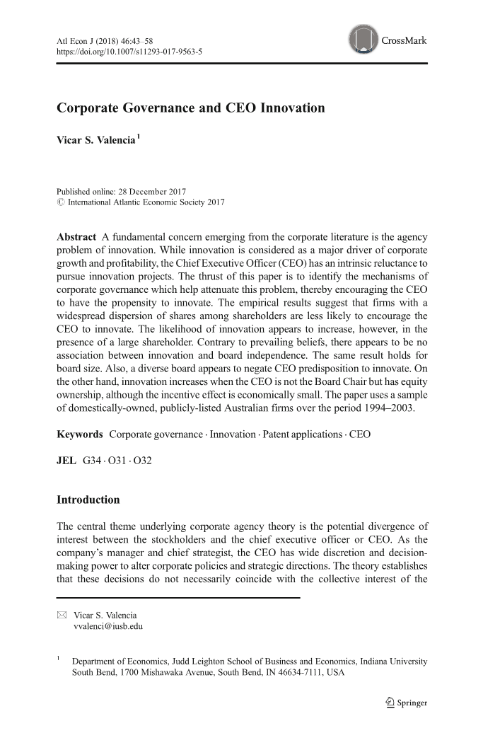 本文的目的是找出激励CEO追求创新的机制,统称为“公司治理”。创新是价值提升投资决策的一个主要例子。波士顿咨询集团报告称,2006-2009年期间,创新型公司(包括苹果电脑、谷歌和特斯拉汽车)的股东总回报率比基准公司高出12.4个百分点。从十年期来看,回报率要高出两个百分点。创新是公司增长和盈利的主要驱动力。然而,这也是一项风险投资。虽然财务回报有利于股东,但内部风险会对CEO未来的职业生涯产生负面影响。波士顿咨询集团在2015年的一项创新调查中,将首席执行官确定为最负责实施创新的人。其发展和可持续性取决于首席执行官的承诺和领导。尽管如此,这项调查也揭示出首席执行官缺乏承诺,这在很大程度上源于一种规避风险的文化。美国管理协会强调了这种过于保守的态度,指出普遍缺乏促进创新的公司结构。创新的实施和可持续性取决于首席执行官的承诺和领导能力。