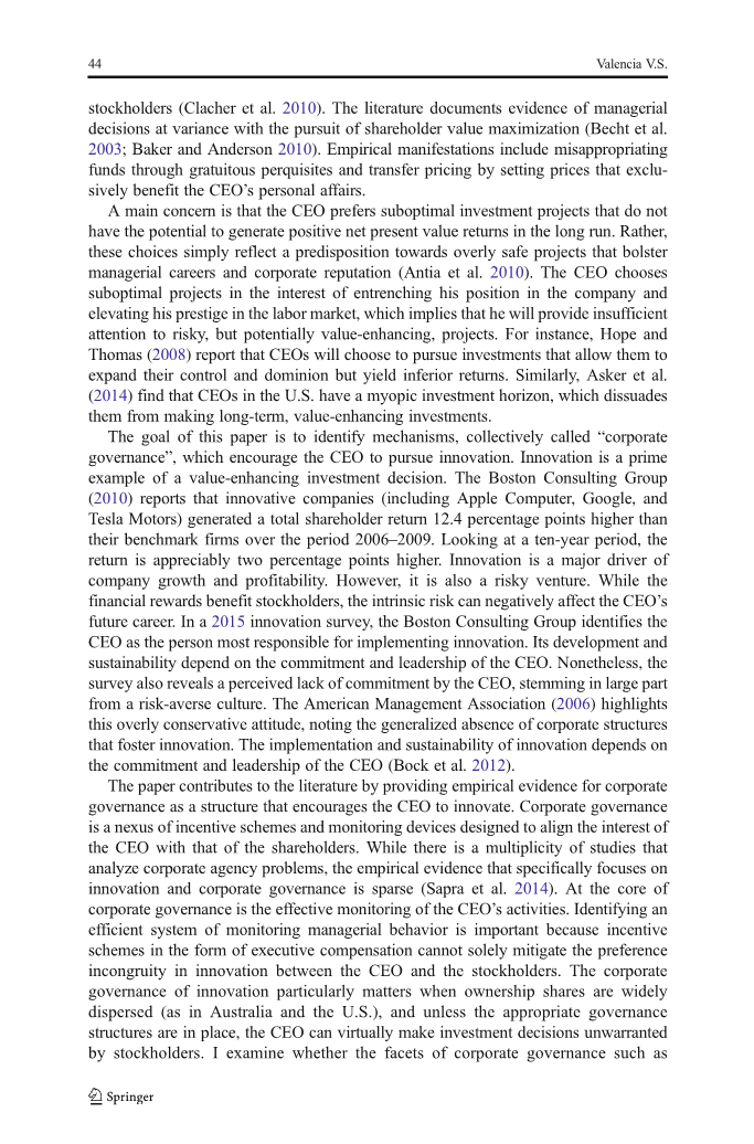 理想情况下,CEO和股东之间的契约应该解决代理问题。然而,即使有最恰当的设计和意图,一份详细说明首席执行官职责和允许的行动界限的合同最终也是次优的。合同涉及大量的交易成本,使其不完整或不可理解。没有一份合同可以解释世界的所有未来状态以及首席执行官可能采取的行动。利益的分歧和无法建立一个完美的契约为公司治理提供了理论基础。如果实施得当,公司治理会产生一种制度,促使首席执行官实施创新项目。从根本上说,公司治理有助于缓解创新的代理问题,在两个方面:(i)评价首席执行官的业绩和(ii)激励首席执行官,通过适当的薪酬计划。关键目标是确定促进创新的治理机制。为了使分析系统化,我将这些机制分为三个主题:(I)股权结构;(ii)董事会;(iii)首席执行官双重身份/持股。