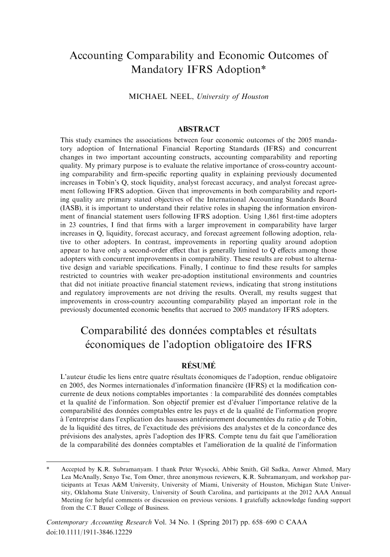 在美国,我研究了强制性国际财务报告准则的采用与信息不对称的几个市场和分析师代理之间的实证关联的变化,其条件是采用日期前后的可比性和报告质量的变化。在控制了公司和宏观层面的其他影响因素后,结果表明,采用国际财务报告准则带来的经济效益在跨国会计可比性方面表现出较大改善的公司中最为显著。相比之下,特定公司报告质量的改善似乎只产生了边际效应,一般仅限于那些同时表现出可比性增加的采用者的估值效应。我着重于两种财务报告结构,可比性和报告质量。有几个原因。首先,两者的改进是国际会计准则理事会(IASCF 2001)的主要既定目标。因此,重要的是了解他们的相对角色塑造的信息环境的财务报表使用者采用后。第二,这两种构念所传达的关于企业的信息不同。可比性描述的是两家或两家以上公司的会计结果的相似程度(FASB 2010)。因此,它不同于通常研究的会计质量计量方法,如可操控性应计项目、应计质量和收益平滑。这些盈利属性是公司特有的,经常独立于其他公司的属性计算(De Franco和Verdi 2011)。此外,可比性的独特之处在于它能够促进企业之间的基准测试。第三,最近的研究文件表明,在强制采用国际财务报告准则后,可比性平均上升(Yip和Young 2012)。相比之下,关于强制性国际财务报告准则的采用如何影响报告质量的证据在几篇论文中是混合的克里斯坦森,李和沃克。第四,先前的研究表明,两种报告质量和可比性与信息不对称的实证代理相关(例如,Welker 1995;Brown and Hilligeist 2007;De Franco等人,2011;朗、林斯和马菲特2012年)。然而,据我所知,没有一项研究试图能评估这两种财务报告结构对彼此的相对重要性,尽管有人猜测这两种结构可能有关联(Barth, Landsman, Lang, and Williams, 2012)。我在本研究中包括的经济结果变量旨在捕捉强制性国际财务报告准则采用前后信息不对称变化的互补方面。我着重于四个先前研究的采用的经济结果:公司估值,股票流动性,分析师预测收入的准确性,和分析师预测收入的协议。我用托宾Q和来衡量公司估值并且使用Amihud(2002)交易的价格影响、Lesmond、Ogden和Trzcinka(1999)总交易成本和Roll(1984)有效买卖价差来衡量流动性。我用平均一致收益预测和分析师预测来衡量绝对分析师预测错误并且使用分析师盈利预测的标准偏差的离散度。综上所述,这些数据应能反映出成熟投资者和不成熟投资者之间的信息不对称程度。我采用了一种研究设计,根据跨国可比性和采用前后报告质量的同步变化,我将强制性国际财务报告准则采纳者划分为四个不同的处理组。我使用三种标准来评估一家公司与业内同行的跨国可比性,这三种标准遵循FASB和IASB的概念框架的基本逻辑,即如果两家公司在经历相似的经济结果时报告的会计金额相似,那么它们的会计核算就更具可比性。具体来说,这三种衡量方法是基于企业的收益-回报关系、收益-现金流关系和应计项目-现金流关系的相似性。我用三种方法评估一家公司的财务报告质量:以应计项目和现金流之间的企业水平相关性来衡量的收入平滑,基于Dechow和Dichev(2002)的模型的应计项目质量,以及Wysocki(2009)的应计项目质量。我的样本包括1,861个强制性国际财务报告准则采纳者,我使用了横跨2005年1月1日强制性国际财务报告准则采纳日期的分叉样本期:采用前期(2001-2004),样本使用其母国国内会计准则;以及采用后阶段(2005-2008),样本使用国际财务报告准则。我进行了单变量测试和估计面板回归,以解释时变的公司特征、行业固定效应和国家固定效应。在这个分析中,我根据公司在采用前后的可比性和报告质量方面的变化,将每个采用者分为四个不同的治疗组。我的研究设计基于IFRS在这四个治疗组中的影响的相对大小进行推论。