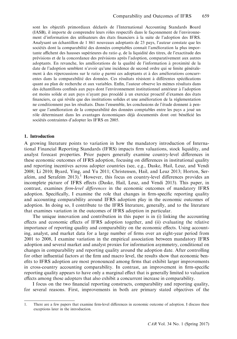 首先,从业者(GAAP 2001)、标准制定者(FASB 2010)和监管者(SEC 2010年2月24日发布的新闻稿2010 - 27)希望采用国际财务报告准则来提高可比性。与此一致的是,最近的研究提供了证据,表明在2005年采用国际财务报告准则后,预期的和已实现的可比性增加(如Armstrong、Barth、Jagolinzer和Riedl 2010;DeFond, Hu, Hung, Li 2011;Yip and Young 2012;(2013年,Jagolinzer和Riedl)。其次,De Franco等人(2011)报告了可比性与分析师预测错误和分散之间的负相关关系,得出的结论是可比性增加了分析师评估公司业绩的能力,增加了分析师对公开(相对于私人)信息的权重。高质量的公共信息应该通过降低信息交易的相对水平来减少信息不对称和增加流动性(Brown和Hilligeist 2007;Brown, Hilligeist和Lo(2004年)和减少对私人信息的激励