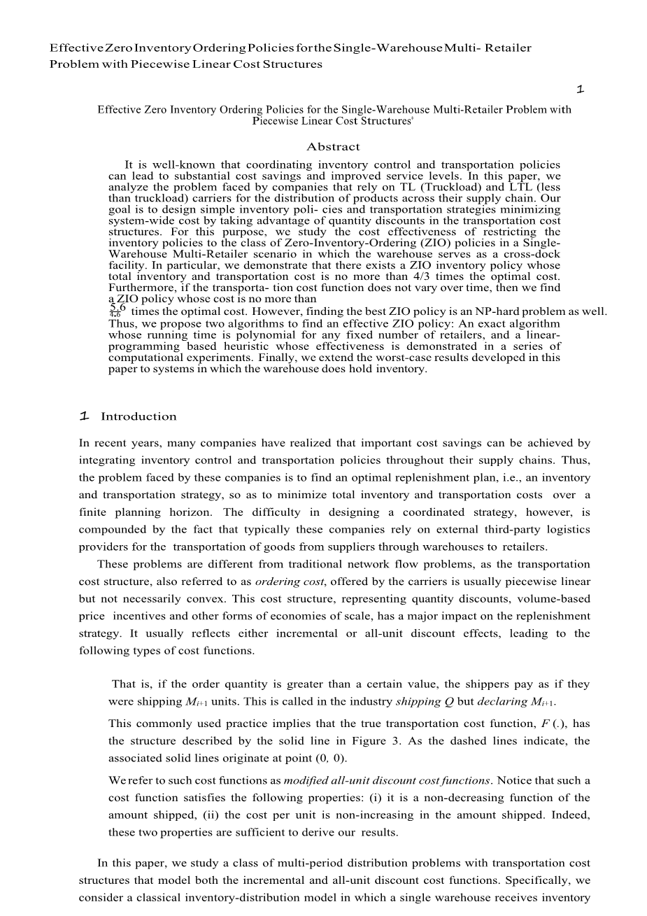 我们在本文中的重点是一类政策,称为零库存订购(Z IO)政策,其中订单是由零售商只有当他们的库存水平下降到零。 可以看出,在凹形运输成本函数的情况下,单仓库多零售商问题存在一个最优的ZIO策略。 不幸的是,Arkin、Joneja和Randy(1989)的结果意味着找到最好的ZIO本身就是NP难的。 当然,我们的模型更一般,如Chan等人所示。 (1999b)对于单一仓库单一零售商的情况,最佳政策可能不是ZIO政策。