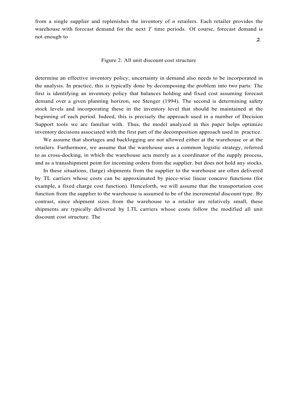 在这些情况下,(大量)从供应商到仓库的货物往往由TL承运人交付,其成本可以用分段线性凹函数(例如,固定费用函数)近似。 今后,我们将假设从供应商到仓库的运输成本函数是增量折扣类型。相比之下,由于从仓库到零售商的装运规模相对较小,这些货物通常由LTL承运人交付,其成本遵循修改后的所有单位折扣成本结构。The