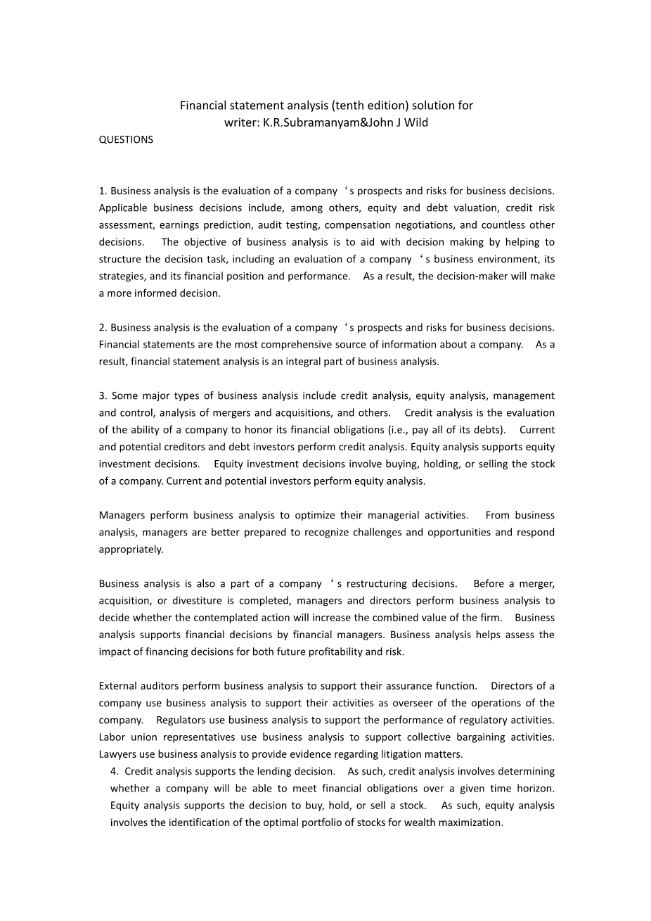 2.业务分析是对公司的前景和业务决策风险的评估。财务报表是有关公司的最全面的信息来源。因此,财务报表分析是业务分析的组成部分。