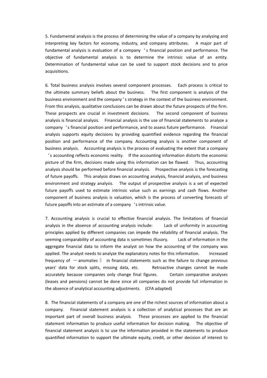 6.总体业务分析涉及几个组成过程。每个过程对于最终总结业务的信念都是至关重要的。第一部分是在商业环境中分析商业环境和公司的战略。通过这种分析,可以得出关于公司未来前景的定性结论。这些前景对于投资决策至关重要。业务分析的第二部分是财务分析。财务分析是使用财务报表来分析公司的财务状况和业绩,并评估未来的业绩。财务分析通过提供有关公司财务状况和业绩的量化证据来支持股权决策。会计分析是业务分析的另一个组成部分。会计分析是评估公司会计反映经济现实程度的过程。如果会计信息扭曲了公司的经济状况,则使用该信息做出的决策可能会出错。因此,应在进行财务分析之前执行会计分析。前瞻性分析是对未来收益的预测。此分析基于会计分析,财务分析以及业务环境和策略分析。前瞻性分析的输出是一组用于估计内在价值(例如收入和现金流量)的预期未来收益。业务分析的另一个组成部分是估值,这是将对未来收益的预测转换为对公司内在价值的估算的过程。