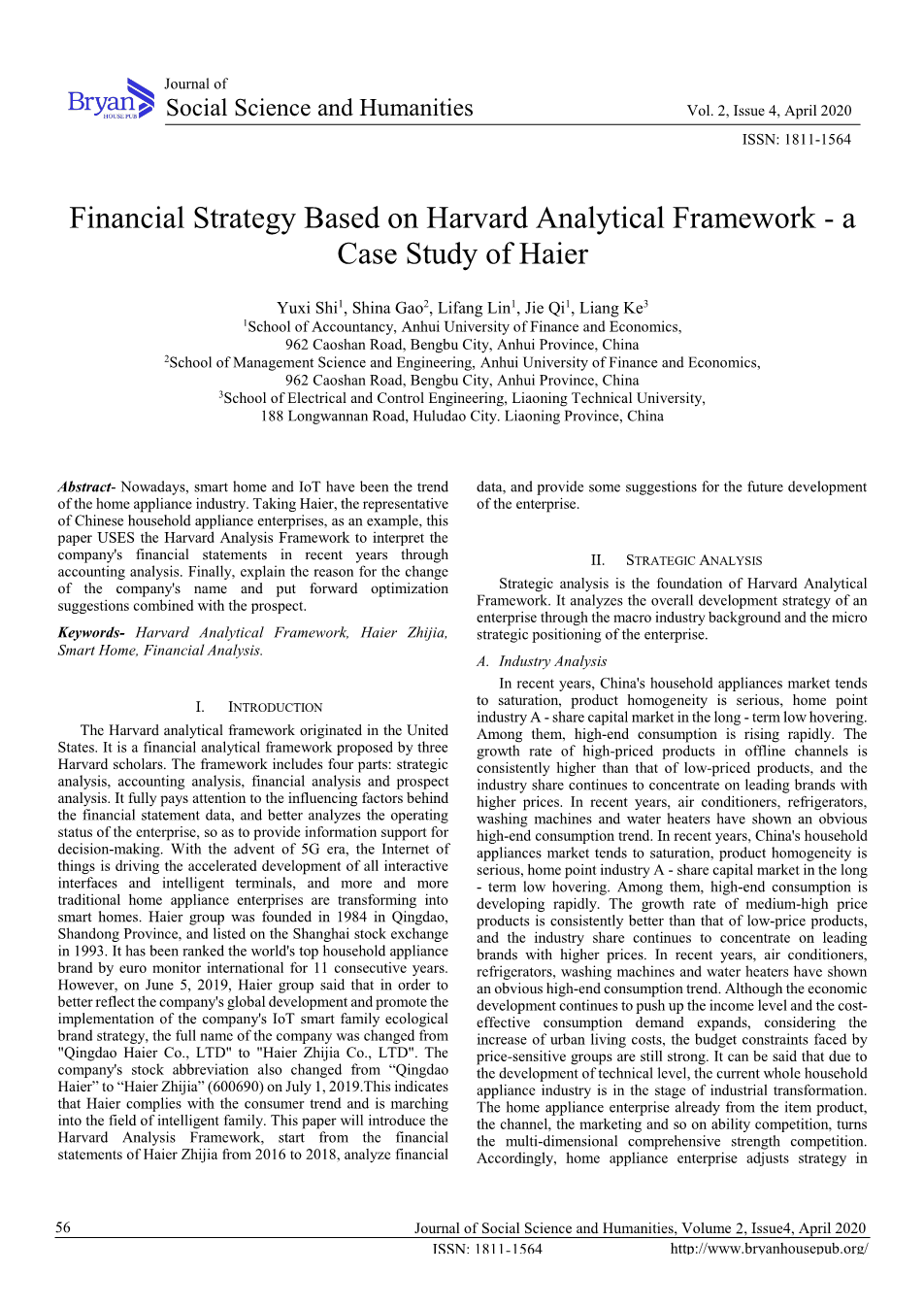 关键词 哈佛分析框架,海尔智家,智能家居,财务分析。