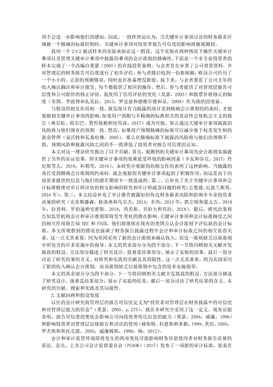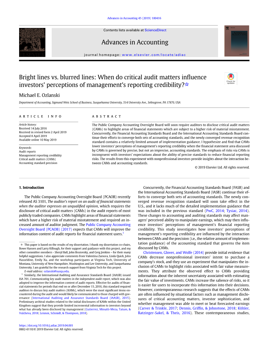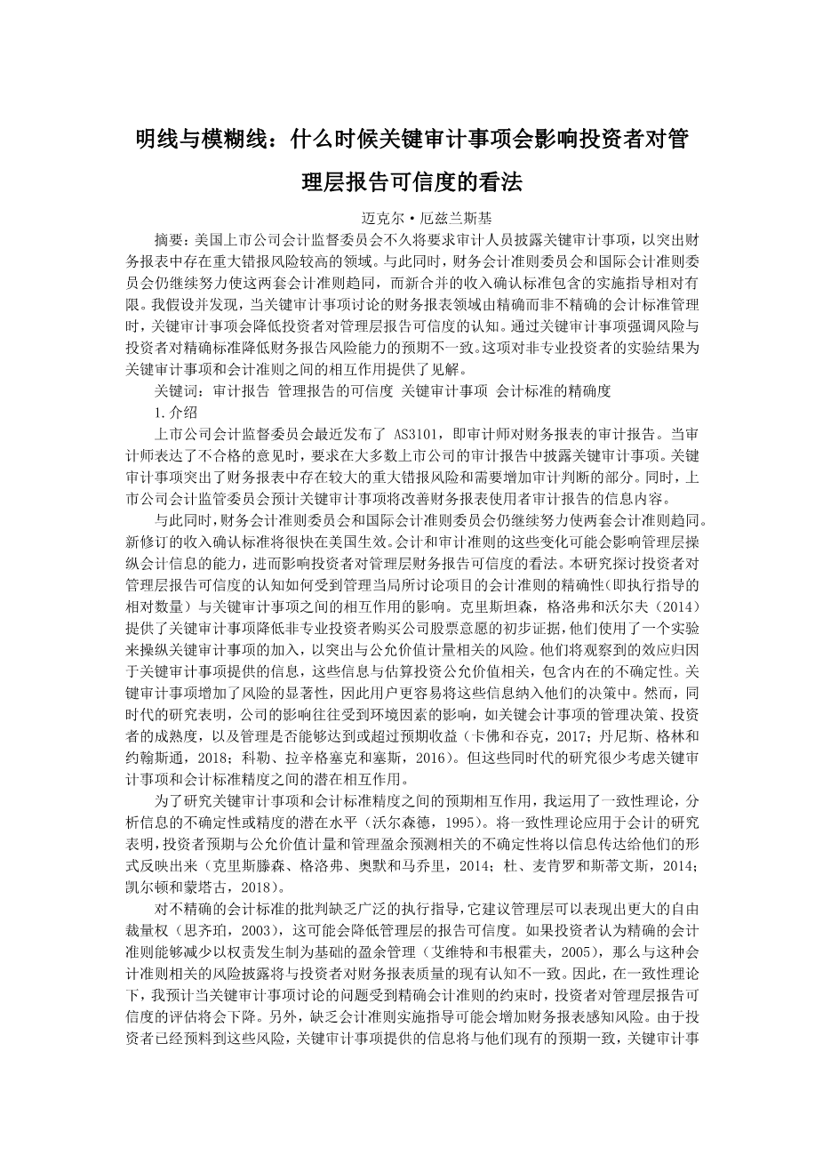 明线与模糊线:什么时候关键审计事项会影响投资者对管 理层报告可信度的看法外文翻译资料 2022-08-13 11:41:09 英语原文共 11 页,剩余内容已隐藏,支付完成后下载完整资料 英语译文共 4 页,剩余内容已隐藏,支付完成后下载完整资料 资料编号:[236515],资料为PDF文档或Word文档,PDF文档可免费转换为Word 原文和译文剩余内容已隐藏,您需要先支付 30元 才能查看原文和译文全部内容!立即支付 发小红书推广免费获取该资料资格。点击链接进入获取推广文案即可: Ai一键组稿 | 降AI率 | 降重复率 | 论文一键排版 PREVIOUS NEXT 您可能感兴趣的文章 预算创新、信息质量和部门绩效外文翻译资料 印度信息技术行业财务分析 ——以威普罗和印孚瑟斯公司为例外文翻译资料 真实性与公司治理外文翻译资料 财产责任保险公司投资组合选择的决定因素外文翻译资料 失衡:中国财政联邦制的意外结果外文翻译资料 财务弹性是影响亚洲企业投资效率的因素之一外文翻译资料 风险管理在审计中的地位及其重要性外文翻译资料 杠杆和公司绩效:机构环境是否重要?外文翻译资料 印度尼西亚企业社会、环境与财务绩效之间的关系外文翻译资料 为中国纯电动公交行业(PEB) 发展新型商业模式外文翻译资料