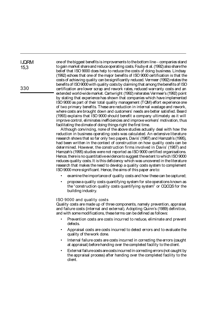尽管这些研究令人信服,但没有一项真正涉及如何计算企业运营成本的减少。一项广泛的文献研究表明,到目前为止,只有两篇论文是关于如何确定质量成本的,它们分别是戴维斯(1987)和哈姆扎赫(1995)在建筑行业背景下撰写的。然而,戴维斯(1987)和哈姆扎赫(1995)研究中涉及的建筑公司没有作为ISO 9000认证组织进行报告。因此,没有定量的证据表明ISO 9000在多大程度上降低了质量成本。正是在文献研究中发现的这一缺陷,使得开发一个质量成本体系来补充ISO 9000的必要性变得更加重要。