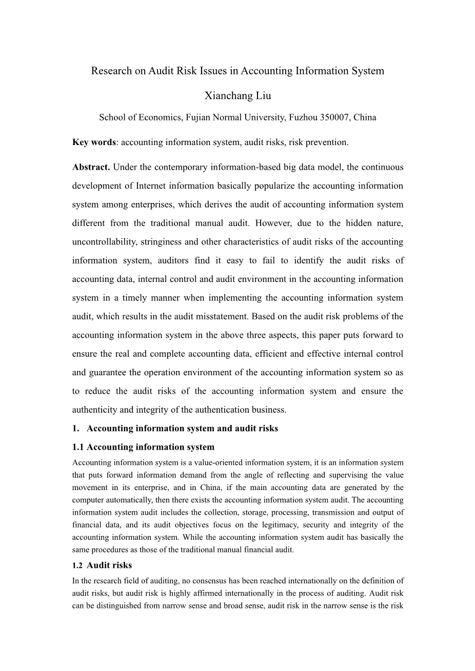 [4] Jiang Huimin.Discussion on Auditing Problems of Accounting Information System [J].Chinese and Foreign Entrepreneurs, 2016, (11).
