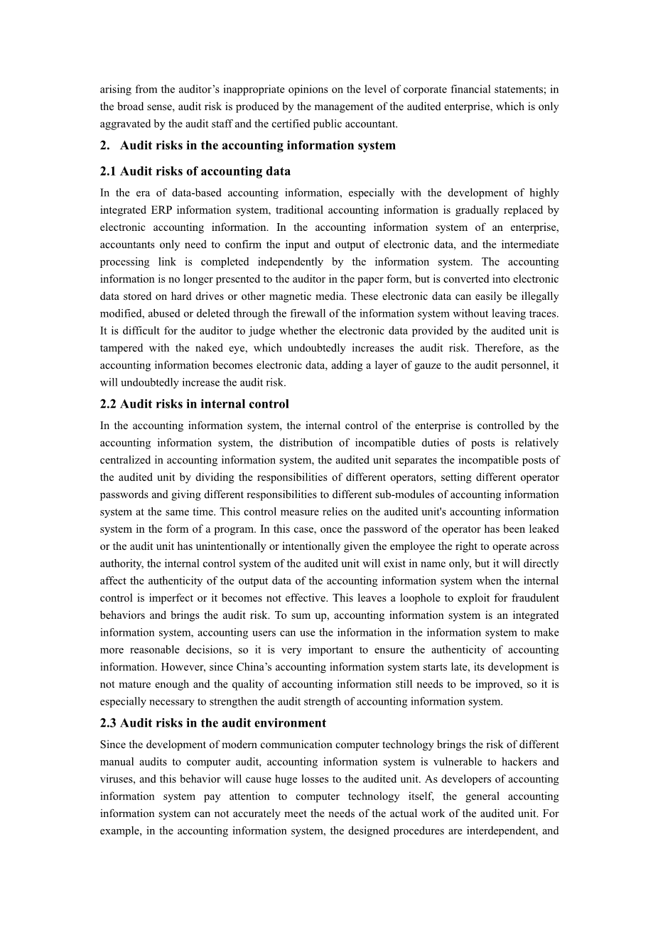 在基于数据的会计信息时代,特别是随着高度集成的ERP信息系统的发展,传统的会计信息逐渐被电子会计信息所取代。在企业的会计信息系统中,会计只需要确认电子数据的输入和输出,中间处理环节就由信息系统独立完成。会计信息不再以纸质形式提供给审核员,而是转换为存储在硬盘驱动器或其他磁性介质上的电子数据。这些电子数据很容易通过信息系统的防火墙被非法修改,滥用或删除,而不会留下任何痕迹。审计人员很难判断被审计单位提供的电子数据是否被肉眼篡改,这无疑增加了审计风险。因此,随着会计信息成为电子数据,给审计人员增加一层网纱,无疑会增加审计风险。