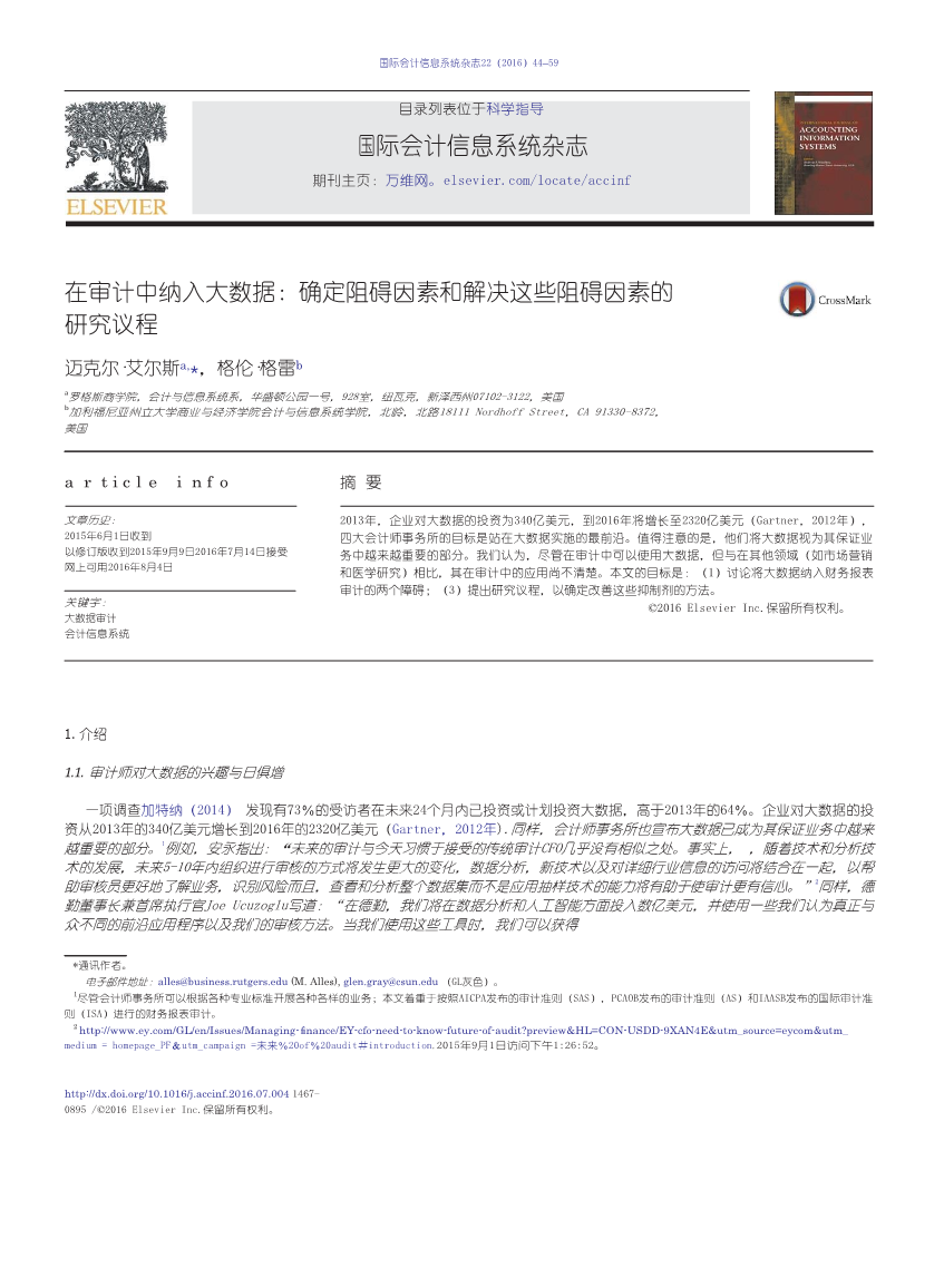在审计中纳入大数据:确定阻碍因素和解决这些阻碍因素的研究议程外文翻译资料 2022-08-13 13:20:58 英语原文共 5 页,剩余内容已隐藏,支付完成后下载完整资料 英语译文共 16 页,剩余内容已隐藏,支付完成后下载完整资料 资料编号:[236425],资料为PDF文档或Word文档,PDF文档可免费转换为Word 原文和译文剩余内容已隐藏,您需要先支付 30元 才能查看原文和译文全部内容!立即支付 发小红书推广免费获取该资料资格。点击链接进入获取推广文案即可: Ai一键组稿 | 降AI率 | 降重复率 | 论文一键排版 PREVIOUS NEXT 您可能感兴趣的文章 预算创新、信息质量和部门绩效外文翻译资料 印度信息技术行业财务分析 ——以威普罗和印孚瑟斯公司为例外文翻译资料 真实性与公司治理外文翻译资料 财产责任保险公司投资组合选择的决定因素外文翻译资料 失衡:中国财政联邦制的意外结果外文翻译资料 财务弹性是影响亚洲企业投资效率的因素之一外文翻译资料 风险管理在审计中的地位及其重要性外文翻译资料 杠杆和公司绩效:机构环境是否重要?外文翻译资料 印度尼西亚企业社会、环境与财务绩效之间的关系外文翻译资料 为中国纯电动公交行业(PEB) 发展新型商业模式外文翻译资料