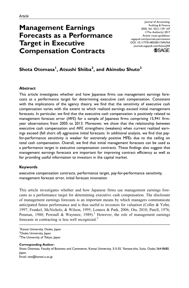 本文调查了日本公司是否以及如何将管理收益预测作为确定执行人员现金报酬的绩效目标。公开管理收益预测是管理者传达预期的未来业绩的重要手段,因此对投资者有用,有助于估值(Coller&Yohn,1997; Frankel,McNichols&Wilson,1995; Lennox&Park,2006; Ota,2010 ; Patell,1976; Penman,1980; Pownall&Waymire,1989)。但是,管理层对收入预测在订约中的作用的认识却很少。